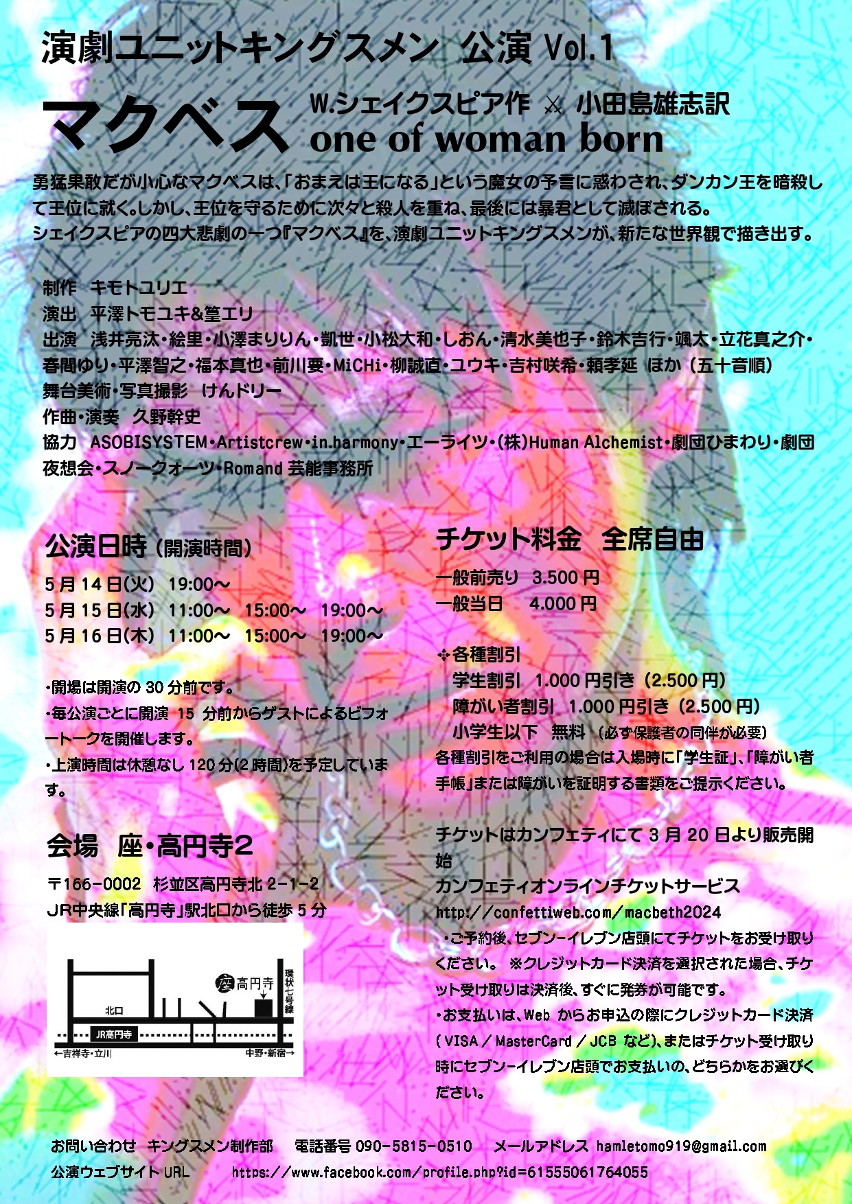 King's Men (キングスメン)(代表:平澤智之)主催、『マクベス』が2024年5月14日 (火) ~2024年5月16日 (木)に座・高円寺2(東京都杉並区高円寺北2-1-2)にて上演されます。