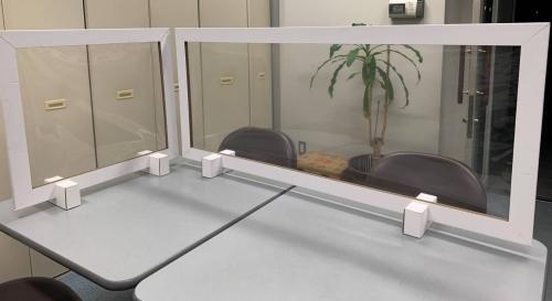 今回の出展では、飛沫感染防止用のダンボール製パーテーションをご紹介します。組み立て式ですのでしっかりとしていて、厚めのOPPシートを使用していますので、掃除も簡単にできます。