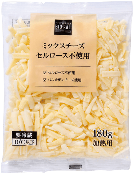 お子様から大人までみんな大好きなチーズ。そんな人気のあるチーズで、健康に気を遣った商品を作りたいと考え開発しました。セルロースを使用しない代わりに乾燥パルメザンを加えることで、チーズ同士がくっつくのを防ぎ、鮮度・味を守ります。さまざまな料理にご使用いただけます。