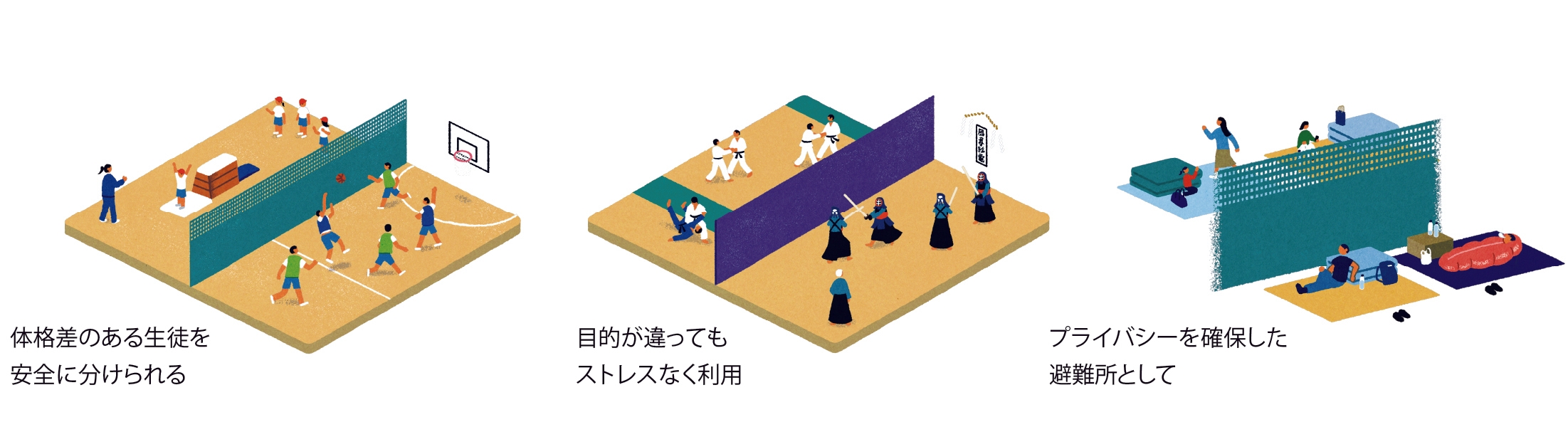 日本国内の体育館施設のうち、約75%は学校の体育館です。スポーツ庁では現在、全国に30,000余りあると言われる学校の体育館を、地域の人々にもっと活用してもらうための施策(※)を検討しています。さまざまな人が利用するようになると考えられるのが、一つの体育館を分割して複数の活動を同時に行いたいというニーズの増加。そのような時、子どもからお年寄りまで、あらゆる人が安全にスポーツやサークル活動を行える空間づくりに役立つのがSIKIRUTOです。