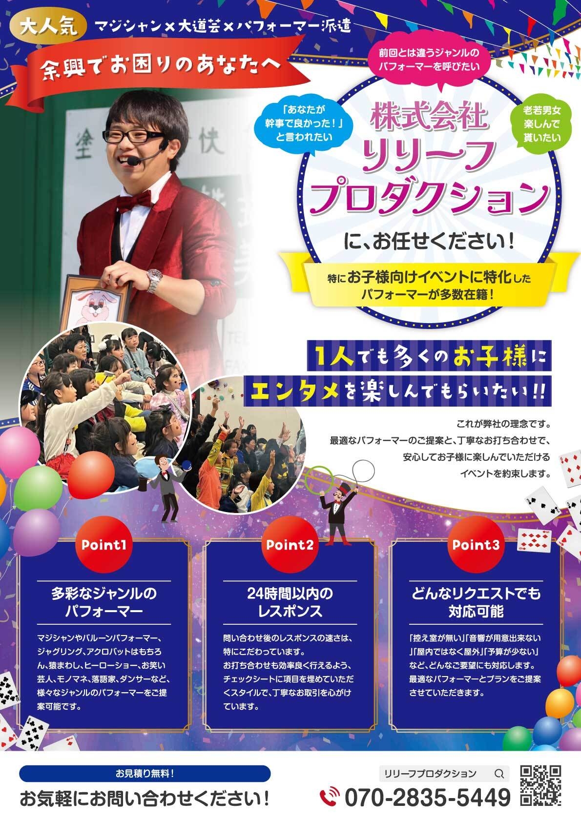 「リリーフプロダクション」は、全国各地の100以上のパフォーマーと提携を結んでいるので、パフォーマーを呼ぶのが難しい地域や、アクセスの悪い会場でもパフォーマーを派遣することが可能です。