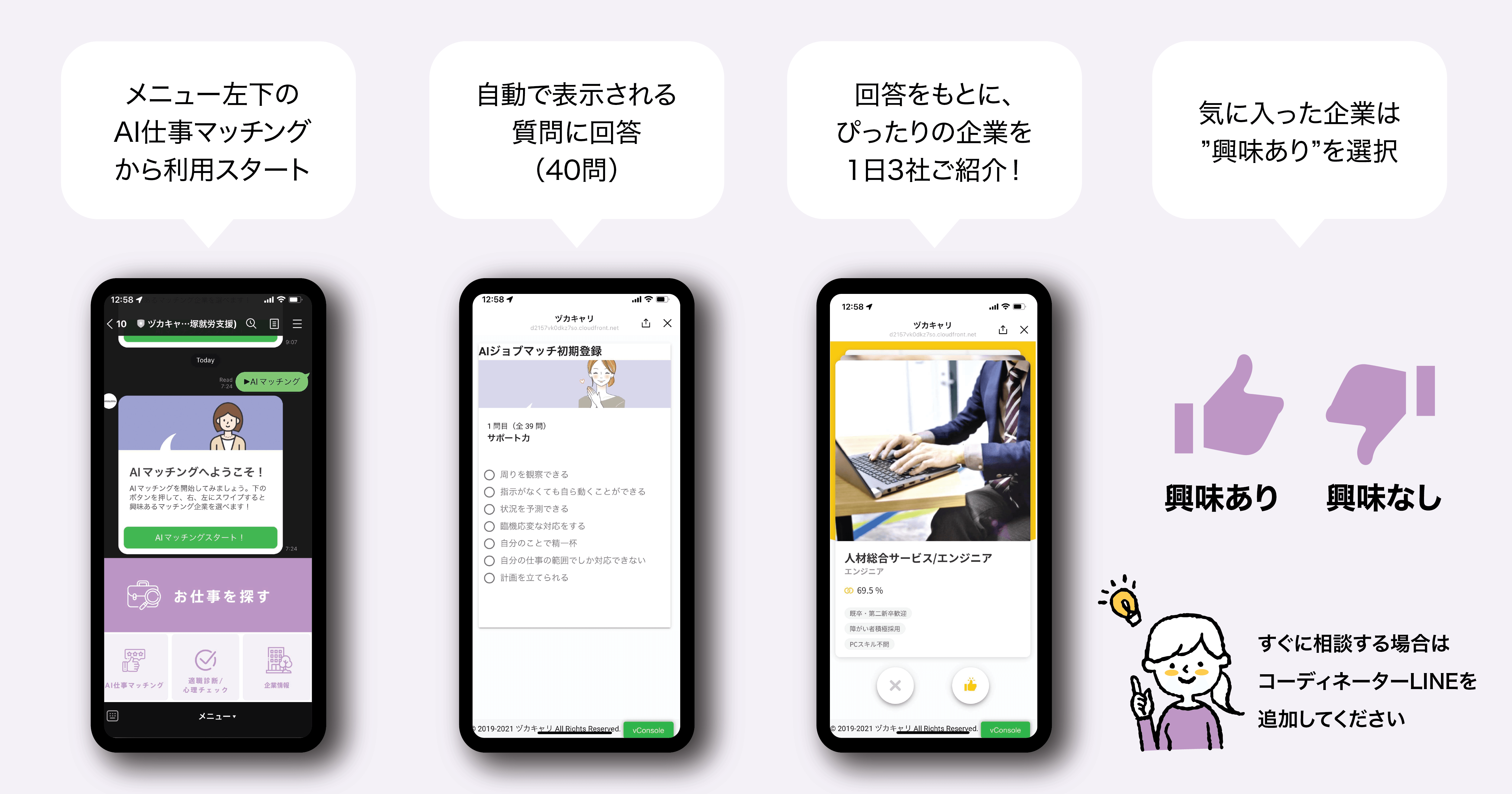 (2)AIが自動で求職者に合った求人を紹介することで、何度も就労の相談に行く手間や心理的ハードルが少なく、手軽に就職活動ができます。
