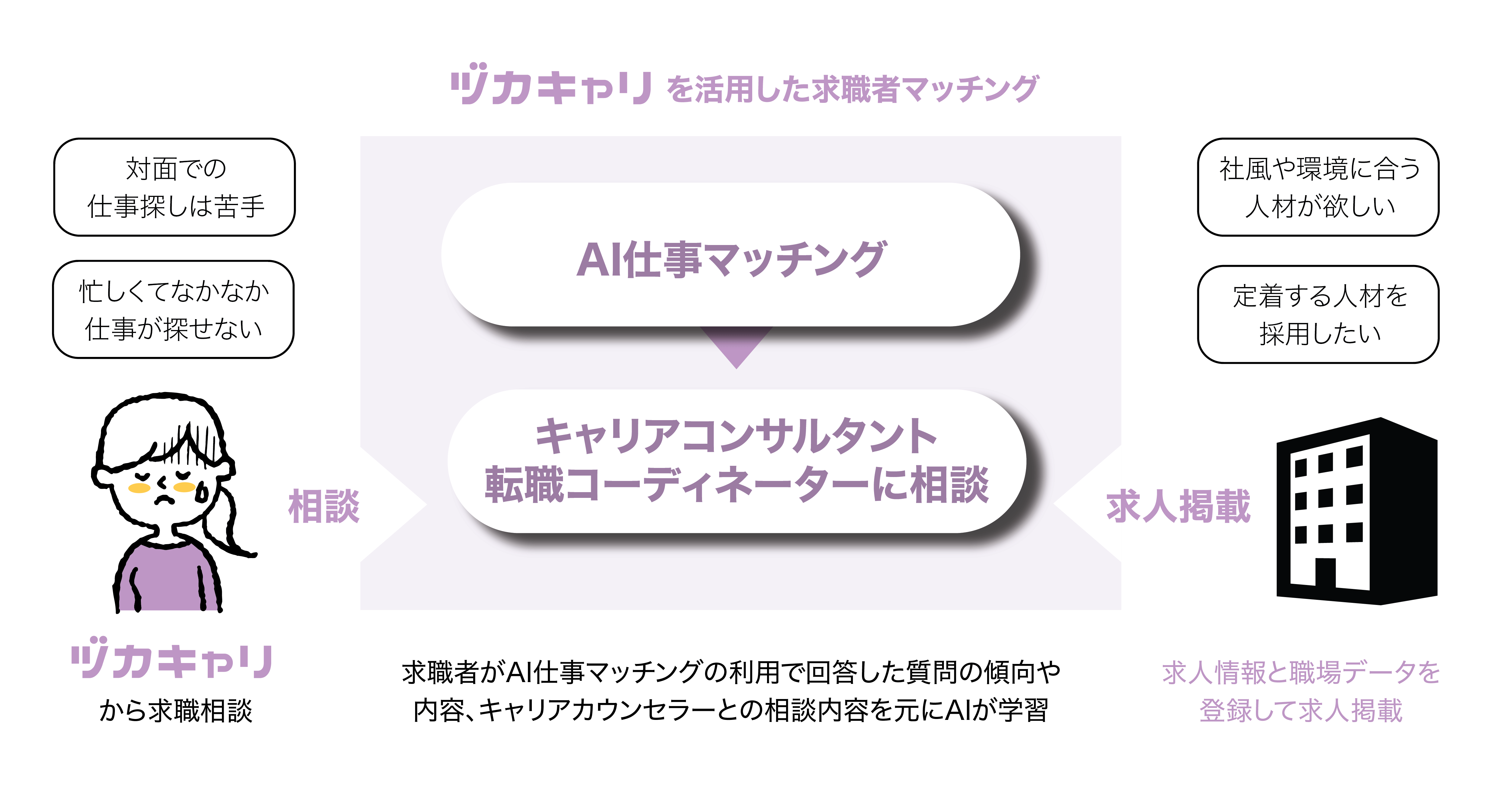 「ヅカキャリ」のAIは、国家資格であるキャリアコンサルタントとして5年以上の経験を有する複数の専門家の暗黙知に基づき、求職者に合った求人情報を探す過程の情報をデータ化し、学習を行っています。