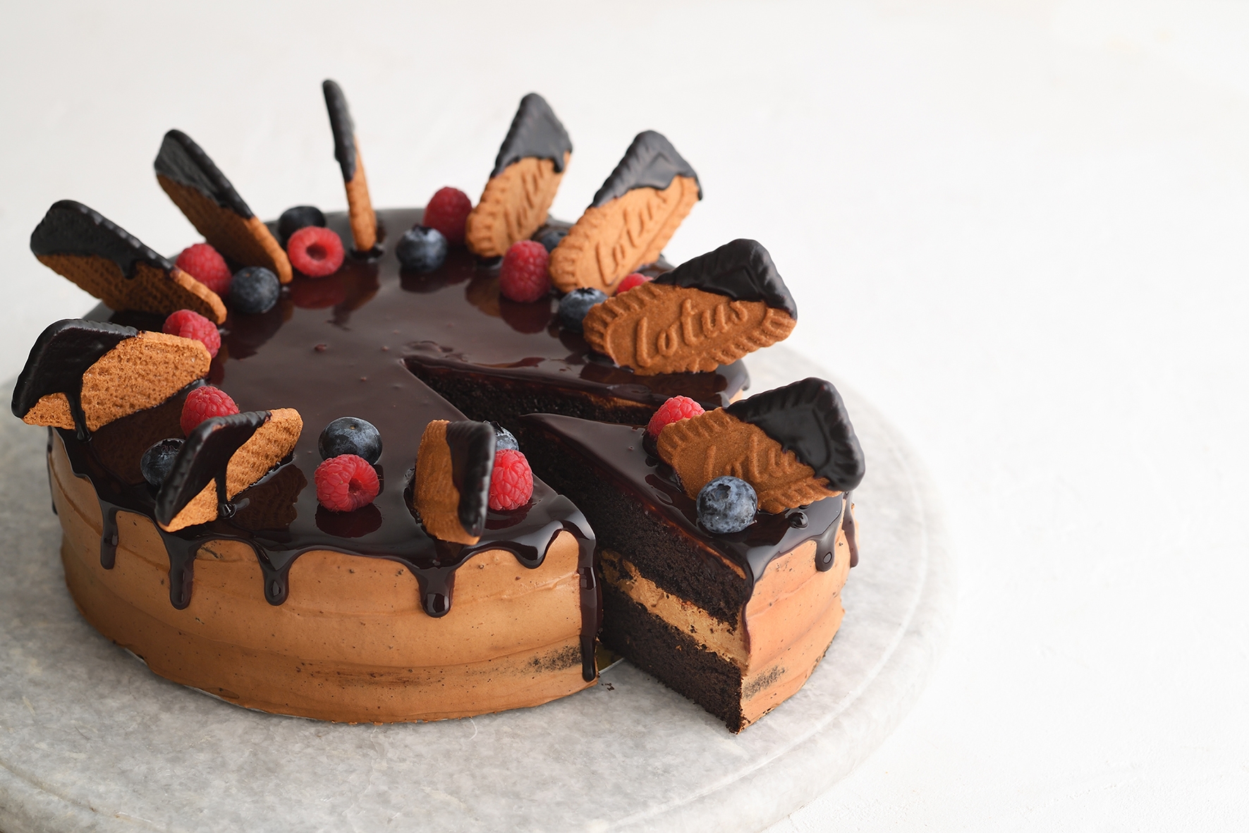 ブラックココアとコーヒー風味の生地に、ロータス ビスケットスプレッドを合わせた自家製クリームでコーティング。チョコレートやベリー、ロータス ビスコフで彩りました。コーヒー風味と、ロータスの程よいシナモンの風味がマッチする、スイーツです。