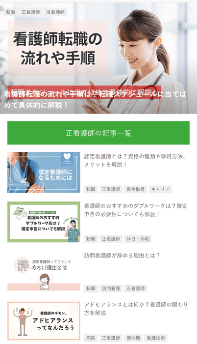 多くの医療職求人や記事を網羅している一方、自身と関係ない求人や記事が同じページ内に混在していることで、検索に時間がかかってしまうデメリットがありました。