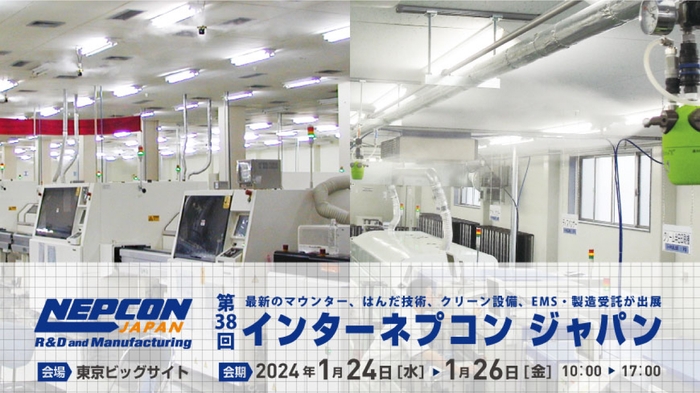 株式会社いけうち(霧のいけうち、本社:大阪府大阪市西区)は、2024年1月24日(水)~ 26日(金)東京ビッグサイトで開催される『第38回 インターネプコン ジャパン』に「2流体加湿システム AirAKI」ならびに、「1流体加湿システム AirULM」を出展いたします。