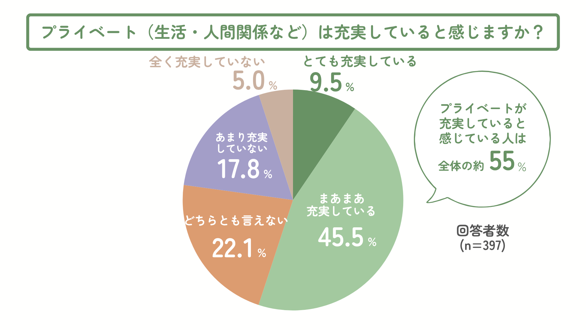 今回の調査では、「プライベートが充実している」と感じている人は全体の約55%という結果になりました。裏を返せば、半数近くの人が、生活や人間関係にどこか満ち足りなさを感じているという結果です。