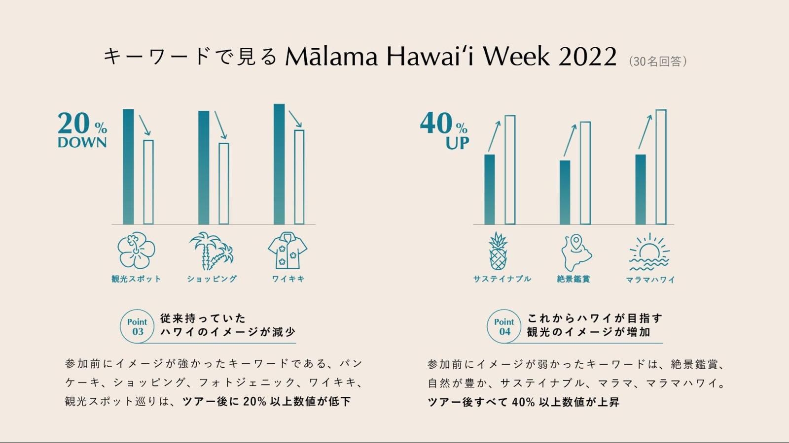 ハワイ州観光局 日本支局(所在地:東京都千代田区 支局長:ミツエ・ヴァーレイ)は、株式会社TABIPPO(東京都渋谷区 / 代表取締役社長 清水直哉)と協力して、Z・ミレニアル世代を対象としたハワイの魅力とレスポンシブルツーリズムの大切さを伝えることを目的としたキャンペーン「Mālama Hawaiʻi Week 2022(マラマ ハワイ ウィーク 2022)」を10月14日から実施した結果、50名がマラマなハワイ体験ができるモニターツアー&イベントに参加し、マラマハワイに関する1000を超えるUGC(ユーザー生成コンテンツ)を創出しました。またモニターツアー参加者の意識調査結果では、マラマハワイの理解度と好感度が高まり、新しいハワイの観光のあり方が好意的に受け入れられたことが分かりました。