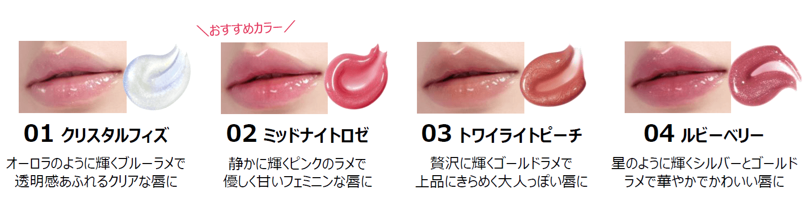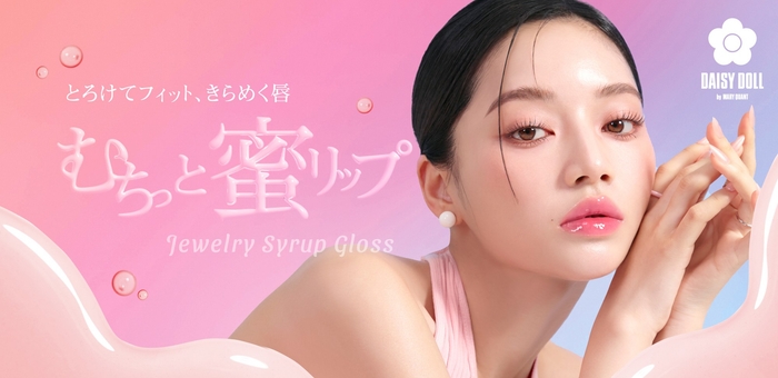 リップグロス市場では「保湿」「荒れにくさ」「カラー展開」などへのニーズが高く、同時にラメやツヤ、ぷるぷるとした粘膜感のある仕上がりがトレンドとして注目されています。デイジードール ジュエリー シロップ グロスはそんな声に寄り添って生まれたリップケア発想のグロスです。唇をしっかり包み込むうるおいベールが、まるでリップパックのように密着。ハチミツや5種の植物オイルをはじめとした充実の保湿成分がうるおいを与え、乾燥や荒れから守ります。ジュエリーのような輝きを放つたっぷりのラメと、シロップのようなとろけるツヤのベールが重なり合い、ぷるんとツヤめく理想の唇が長時間続きます。「ラメ × ツヤ × ニュアンスカラー」のトレンド感あふれる絶妙な4色のカラー展開で、あなたにぴったりの1本を見つけてお楽しみください。