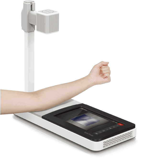 「静脈可視化装置 Vein Probe VPism-D+」は、皮膚に近赤外線(波長850nm)を非接触的に照射し、その反射光から表在静脈の位置をディスプレイに表示します。本品は、目的部位の静脈を非接触的に視覚化することにより医療従事者の検査、処置等を支援する医療用補助装置です。
