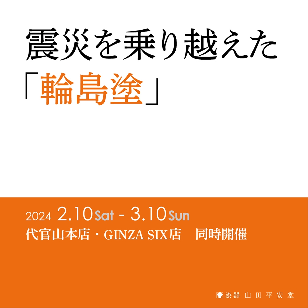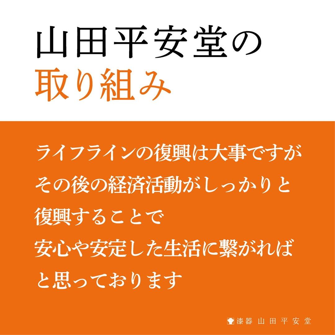 「漆器 山田平安堂」は、オリジナル・デザインの漆器を通じ、皆さまのライフスタイルを豊かにする会社ですが、痛ましい能登半島地震を踏まえ、親交ある輪島塗や輪島塗に関わる方々の復興を、主に経済的に、かつ永続的に支援できる仕組みはないかと考え、その第1弾として「震災を乗り越えた輪島塗」の販売会を代官山本店・GINZA SIX店にて開催いたします。