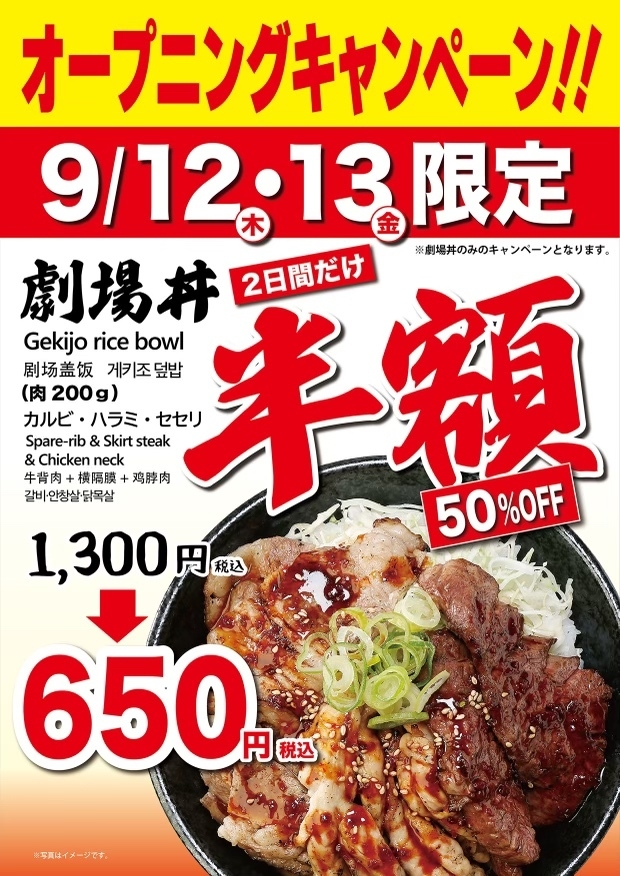 9月12日のオープン日と9月13日の2日間限定で、ハラミ・カルビ・セセリの3種類の肉が乗っている『劇場丼 200g』が半額になるオープニングキャンペーンを実施します。