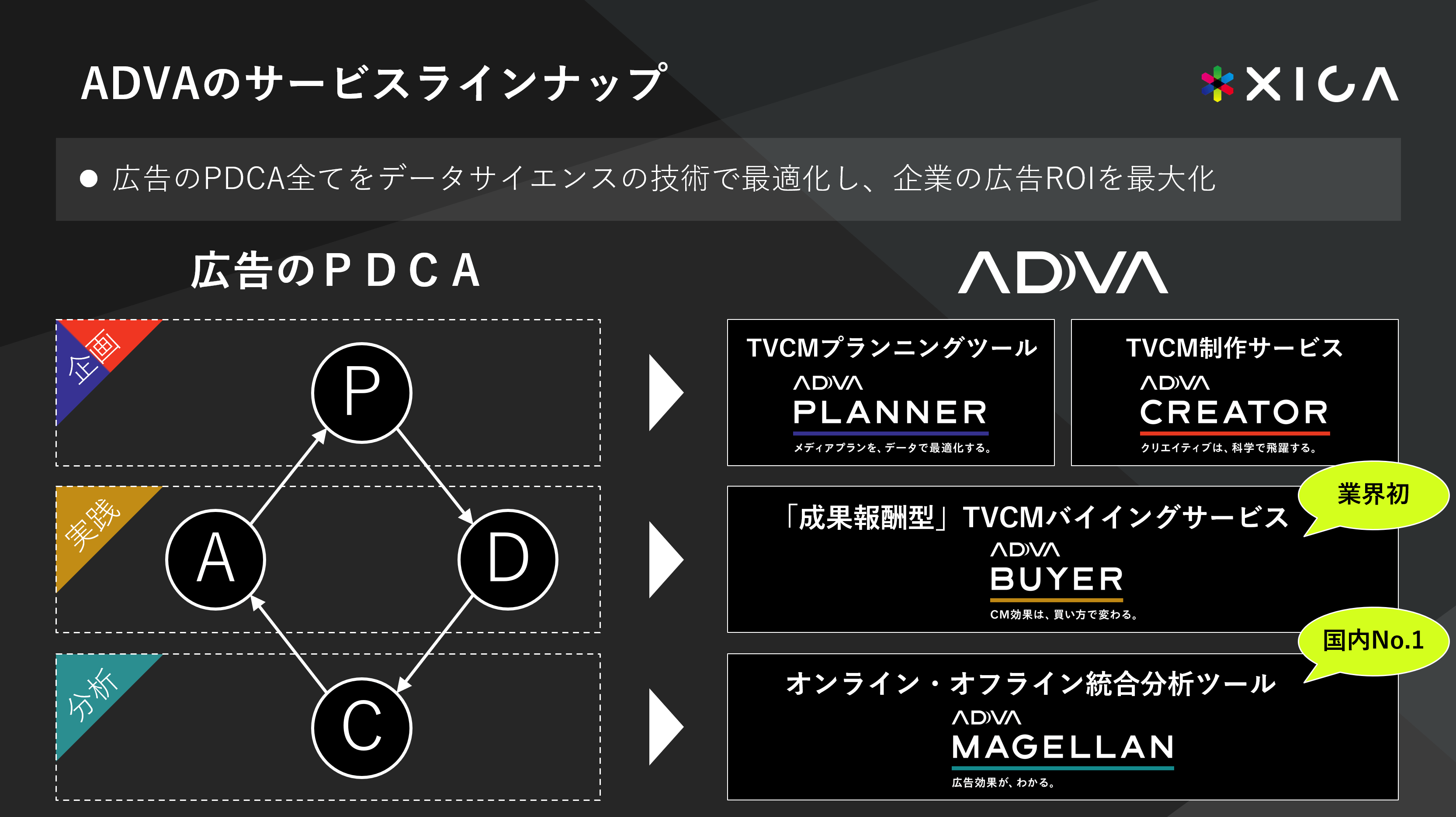 サイカは、データサイエンスを駆使してマーケティング成果を最大化するアドソリューション「ADVA」を提供しています。ADVAのサービスラインナップには、オンライン広告・オフライン広告の統合分析ツールとして国内No.1(*1)の「ADVA MAGELLAN」や、業界初の成果報酬型テレビCMバイイングを実現した「ADVA BUYER」などが含まれ、広告宣伝費トップ100社(*2)の30%以上の企業でマーケティング分析にADVA MAGELLANが利用されるなど、大手企業を中心に高い評価を得ています。