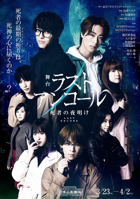 2020年3月よりアプリ「マンガボックス」で大人気連載中の漫画家、志宇(しう)のオリジナル作品「ラストアンコール」を舞台化。5人組ダンスボーカルグループ「BUGVEL」のKOSHINが死神・海(うみ)役、MINATOが探偵・大牙(たいが)役として、舞台初出演にしてW主演を務め、舞台主題歌にはBUGVELの新曲が起用されます。