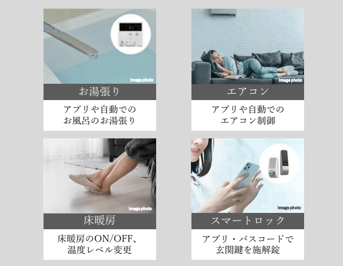 本物件では、全戸にスマートホーム対応の「スマートロック」「給湯・床暖房リモコン」「エアコン」といった機器が標準装備されています。