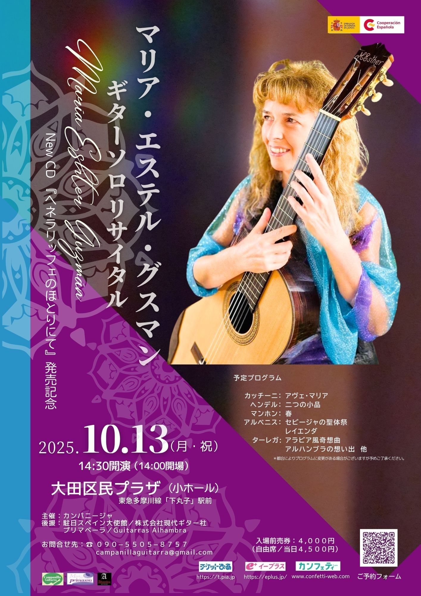 プリマベーラ主催、『ギターの女王』マリア・エステル・グスマン ツアーが2025年10月10日 (金)に横浜市磯子区民文化センター杉田劇場 5Fホール(神奈川県 横浜市磯子区 杉田 1-1-1)にて、2025年10月13日 (月・祝)に大田区民プラザ 小ホール(東京都 大田区 下丸子 三丁目1番3号)にて開催されます。