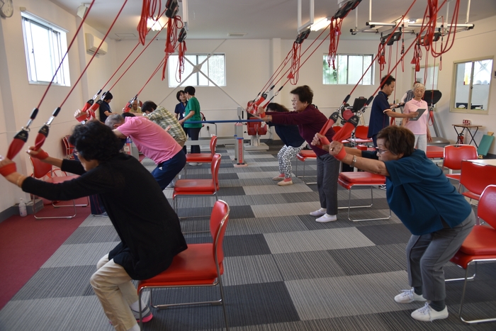 運動指導員は、「レッドコード」というスリングを使用したバランストレーニングや関節に優しい空気圧のマシン等による運動で、身体の機能を改善していきます。また、当社が独自に開発した脳活性化プログラム「シナプソロジー®」を活用し、身体を動かしながら、脳を活性化させることで、注意力や認知機能の向上を図ります。