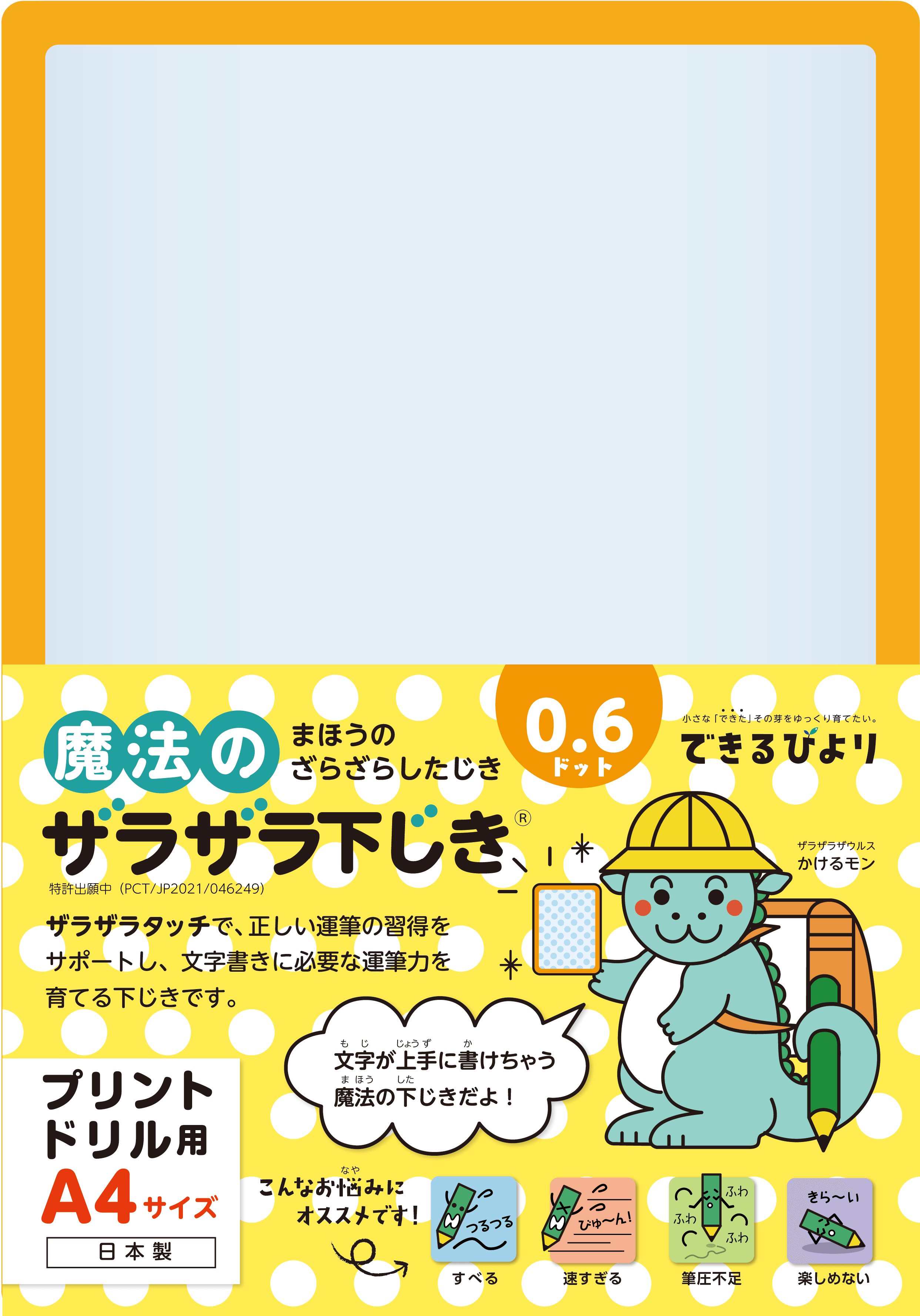 表面に凹凸加工を施した特殊な下じきです。ザラザラとした書き心地が特徴で、鉛筆が滑らず、安定した書字をサポートします。線を止めることができない、文字の形が整わないなどの悩みを抱える子どもたちが「書きやすさ」を実感できる、まさに“魔法”のような下じきです。