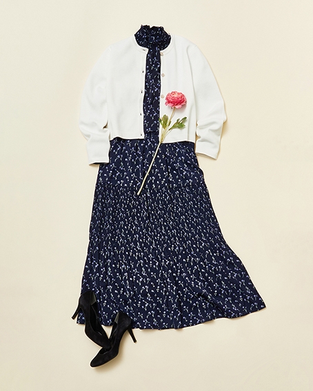 華やかなジャカード素材のワンピースやジャケット、スカートをキーアイテムに、オリジナルの小花柄のプリントアイテムやジャケットライクなカーディガンなど 学校行事や特別なシーンで着用できるのはもちろん、通勤スタイルにも対応できるアイテムをラインナップいたします。