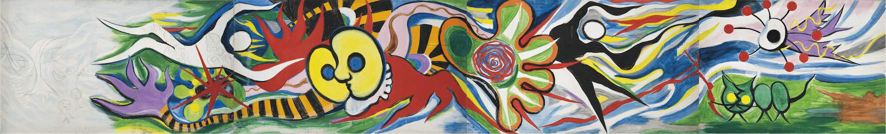 この壁画のアウトラインがはじめて形になったのは1967年9月。2ヶ月におよぶ中南米への取材旅行から帰国した直後のことでした。岡本太郎は中南米を旅するなかでアイデアをあたためたわけですが、じつはもうひとつ、まったく別の作品も同時に構想していました。
