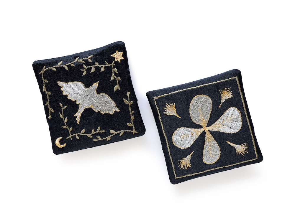 今回の展覧会で作品のモチーフとなっているのは、幸せの象徴として古くから愛されてきたものたち。それらが暗闇を照らす希望……まるで光のように浮かび上がる姿を繊細で美しい刺繍で表現しています。ぜひお近くでご覧ください。