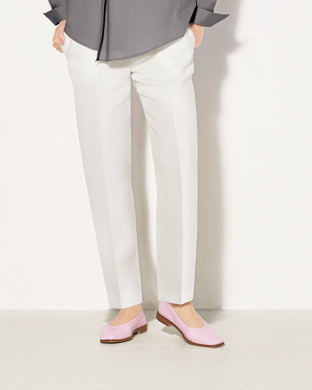 超軽量 約140g。細かなディティ―ルにこだわった、大人の女性にふさわしい上品なフラットシューズ。開放感のある着用感で、fit-slimシリーズにチャレンジしてみたい方にもおすすめです。バッグにポン!と入れて持ち歩けるほどの軽さと、屈曲性の良さに特化したEVAソールを使用。腕のよい職人さんが揃う工場でのみ可能な『プラット製法』でつくられており、硬い中底が使われることなく、やわらかで屈曲性が良いのが特徴。プラット製法ならではの、クッションの厚みが外に見えているのもデザインのポイント。踵やつま先の芯も極力柔らかい物を選定。fit-slimシリーズの中では一番靴先に厚みをもたせ、開放感のある着用感に仕上げています。インソールには、低反発クッションを内蔵した抗菌防臭メッシュ生地を使用。表面には贅沢に豚本革を使用しているため、見た目のナチュラル感と吸水性により快適な靴内環境を保持します。また、実感ヒール高約1.3cmと傾斜が少ないので、安定した歩行を叶えます。