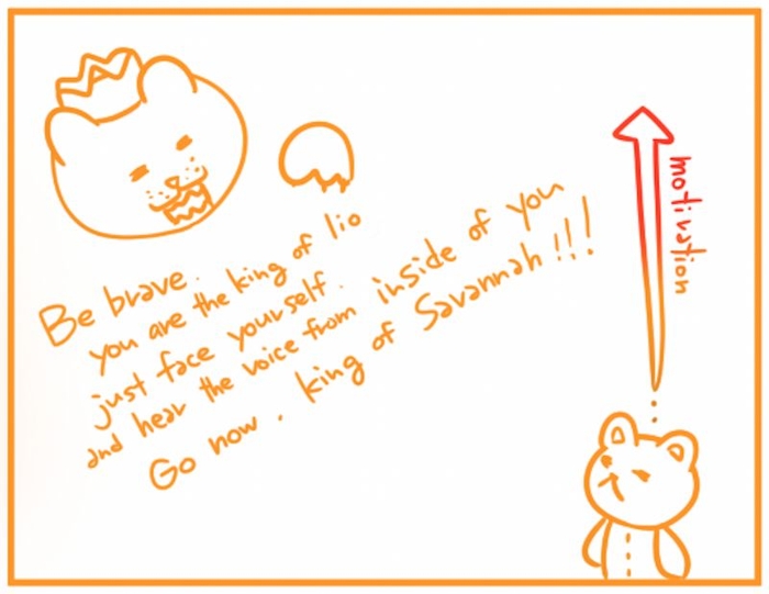 “恐れるな、、、お前はライオンの王の中の王。(注:実際はクマ)自分自身と向き合い、心の奥から湧き出る声をきけばよい。行け!サバンナの王よ!!!!(注:王ではなくクマ)”