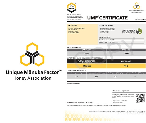 Manuka Wellbeingのマヌカハニーは、UMFはちみつ協会による検査で評価基準を満たした、本物のマヌカハニーです。審査の基準に達した企業のみUMFマークの使用許可がおり、マヌカハニーの品質と純度を証明します。さらに各国市場を定期的にチェックすることで偽造品の購入を防ぎ、安全安心の保証をします。高品質・本物のマヌカハニーを安心してお買い求めください。