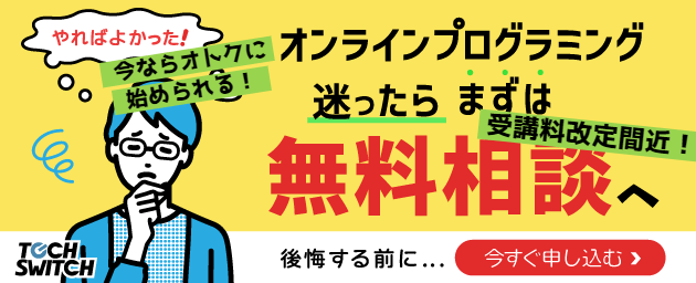 【受講料改定間近】転職のためのスキルが9800円/月~で学べる!プログラミングスクールTECHSWITCH【始めるなら今がチャンス!】