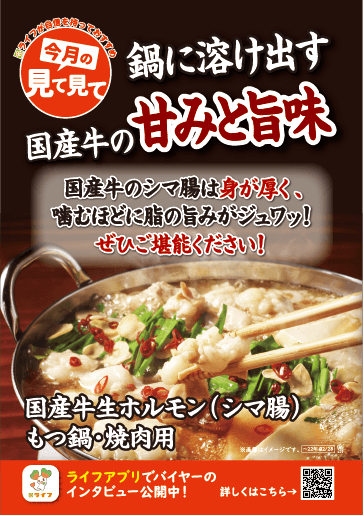 “おいしい” “ワクワク” “ハッピー” をお届けするライフコーポレーションは、寒い時期に食べたくなるもつ鍋にぴったりな「国産牛生ホルモン(シマ腸)もつ鍋・焼肉用」を首都圏店舗にて販売しております。