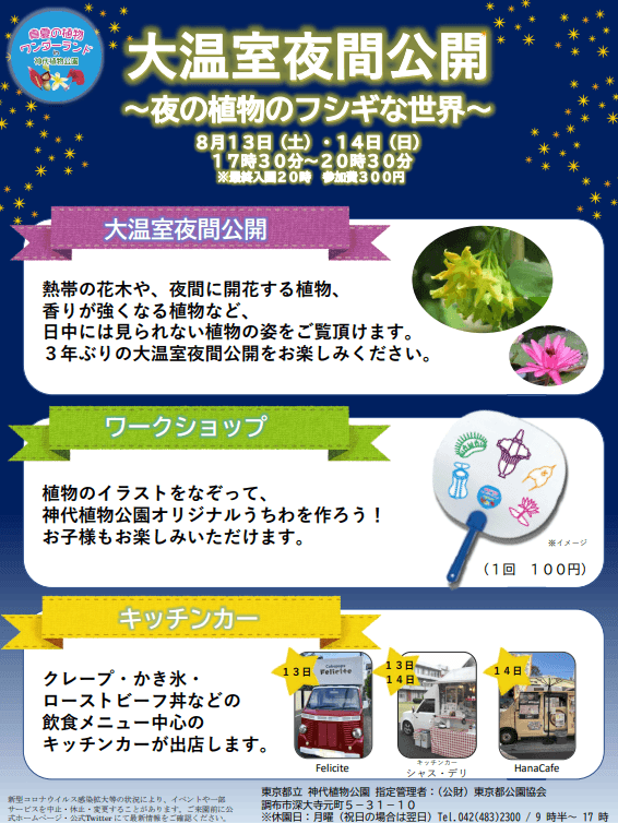※「大温室夜間公開」は「真夏の植物ワンダーランド in 神代植物公園」のイベントの一部として開催しております。