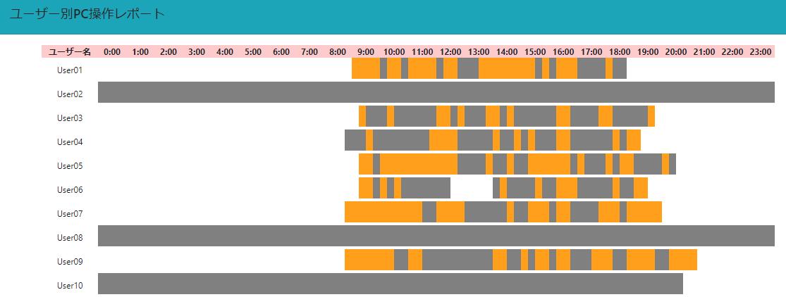 働き方モニタリングレポートのひとつとして提供を予定しているユーザー別PC操作レポート(図3)では、テレワークの場合にPCのログイン、ログオフだけの情報では把握が困難な実際の労働時間をPC操作の有無によって判定を可能にしています。