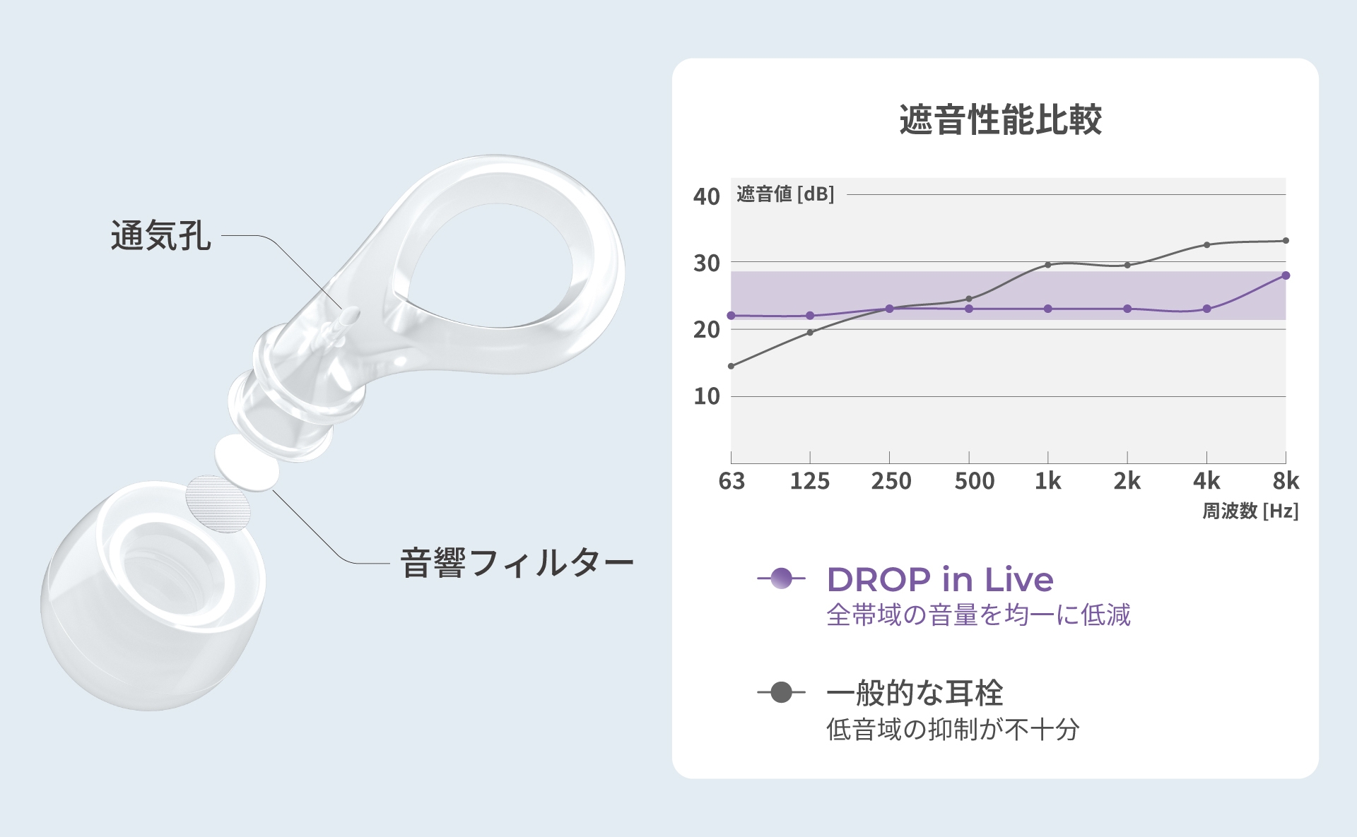 「DROP in Live」は、自然な聞こえを保ったまま、音量を効果的に低減。音響工学の原理に基づいて緻密に設計された空間と通気孔、抑制する帯域をコントロールする音響フィルターによって、耳に届く音声や雑音を全帯域でバランスよく軽減することができます。