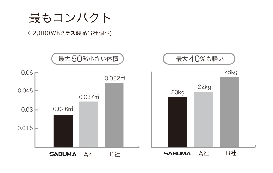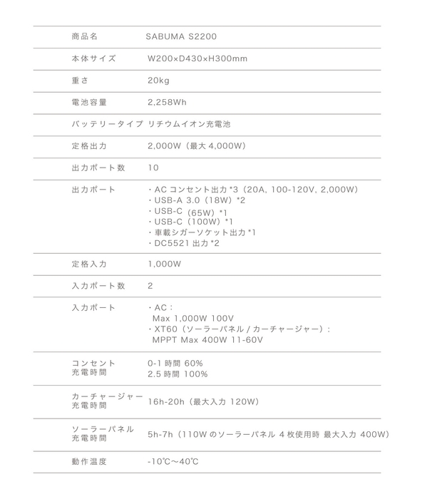 S2200は、電気自動車(EV)でも採用されるBMS(バッテリーマネジメントシステム)、Smart Ventilation System(自律制御放熱システム)などの高度なバッテリー安全性制御技術を開発・採用することで、クラス最小レベルのコンパクトな筐体ながら、2,258Wh / 2,000Wという大容量・大出力のポータブル電源を実現しています。 2,258Wh / 定格出力2, 000WのSABUMA S2200は、例えば50インチテレビを18時間、小型冷蔵庫を50時間以上、電子レンジを連続2時間以上使用できるほどのハイスペックである為、キャンプや車中泊などのレジャー用途だけでなく、災害等による停電時のバックアップ電源としてや、屋外作業を伴うさまざまな業務用途としても十二分に長時間お使いいただくことが出来ます。 それだけのハイスペックでありながら、人に優しい流麗でシンプルなデザインは、さまざまな人々の暮らし、シーンにさりげなく溶け込みます。