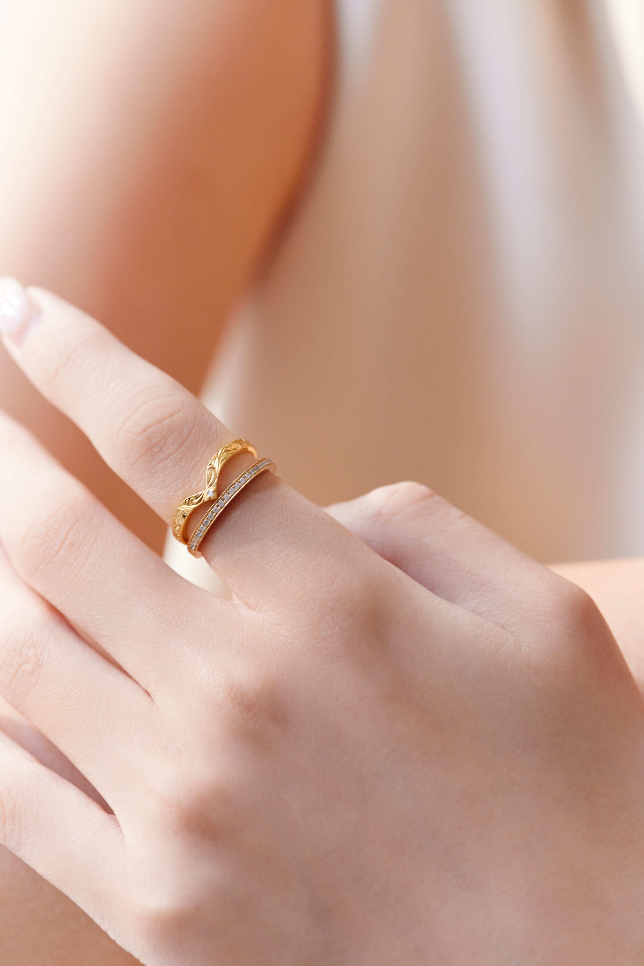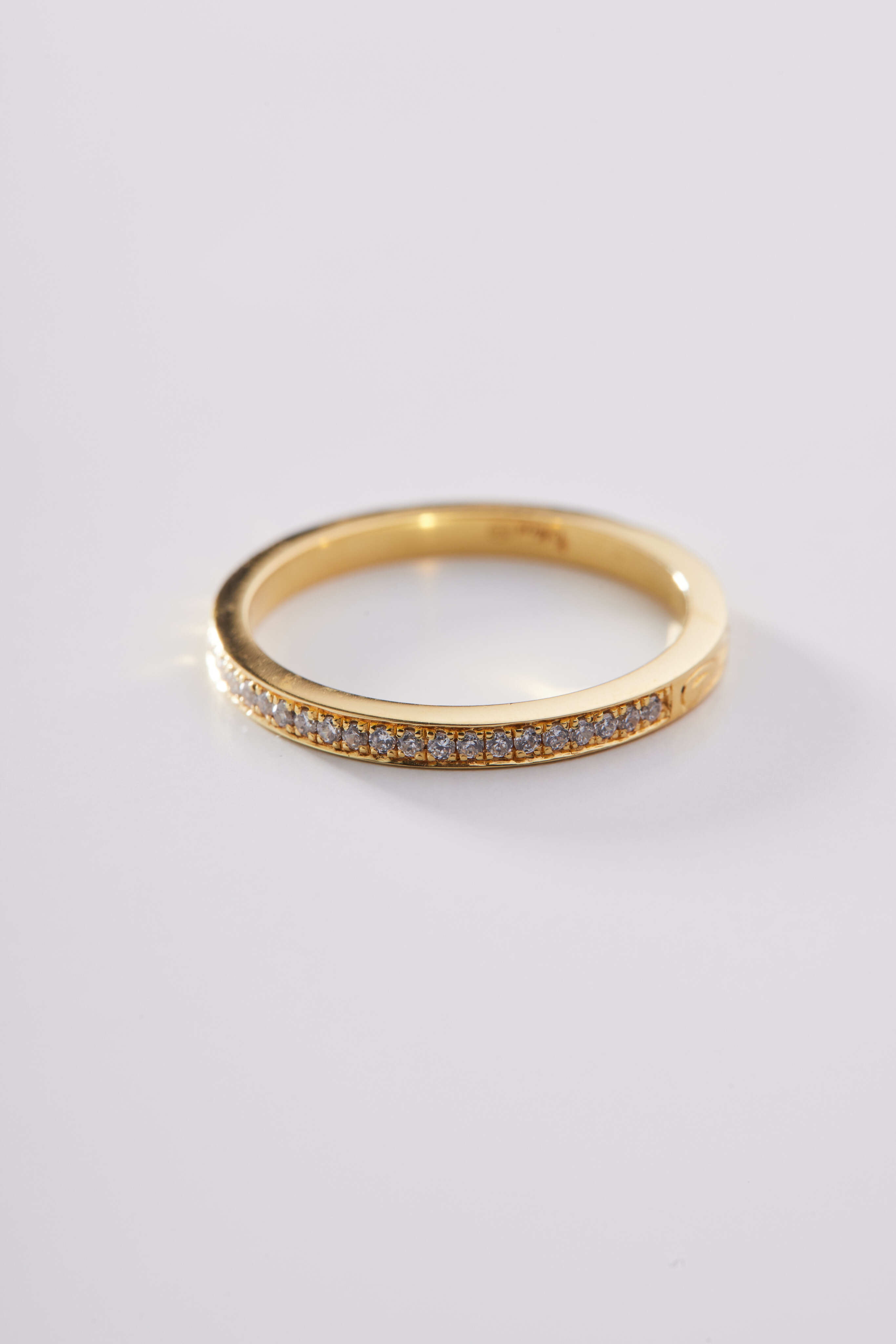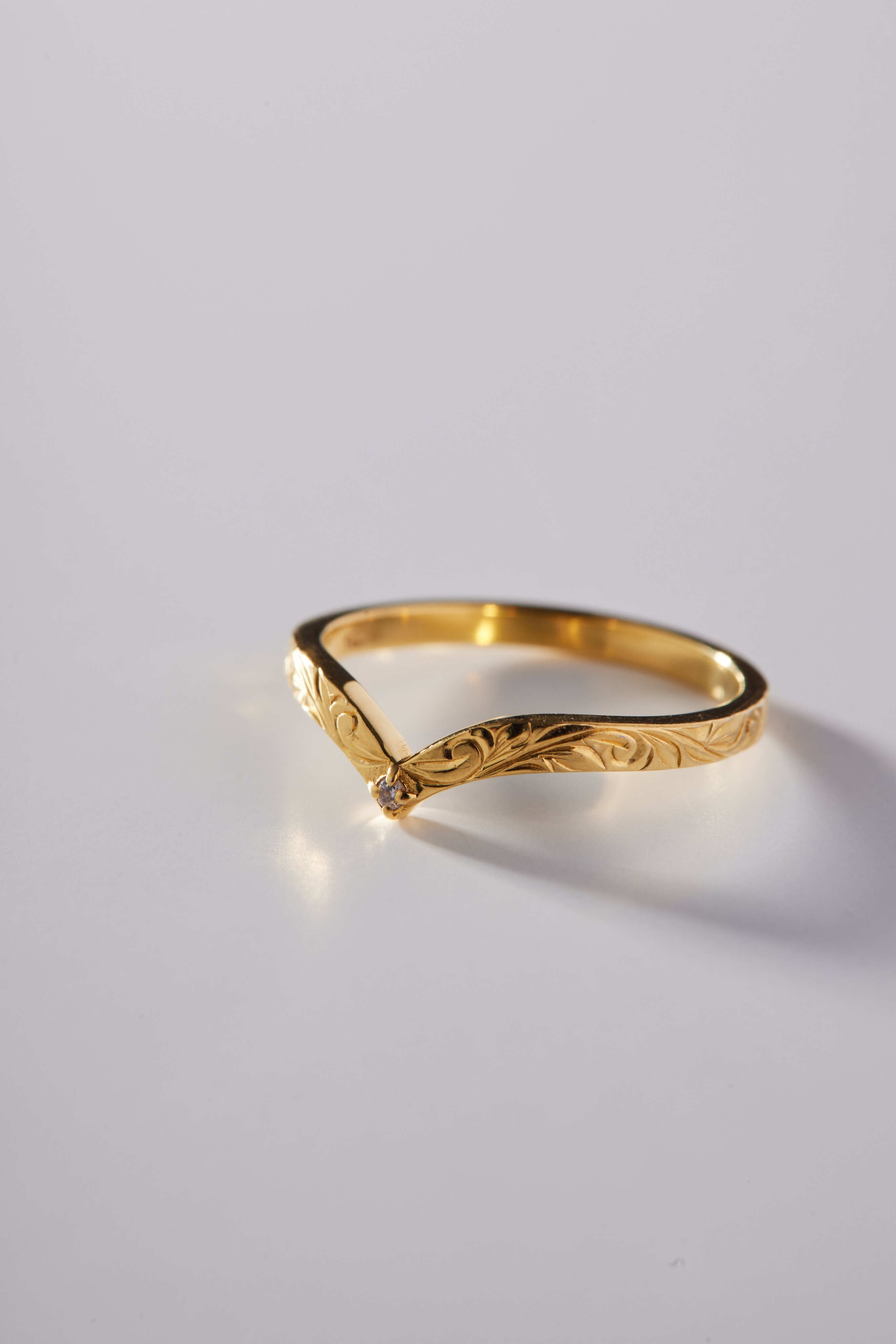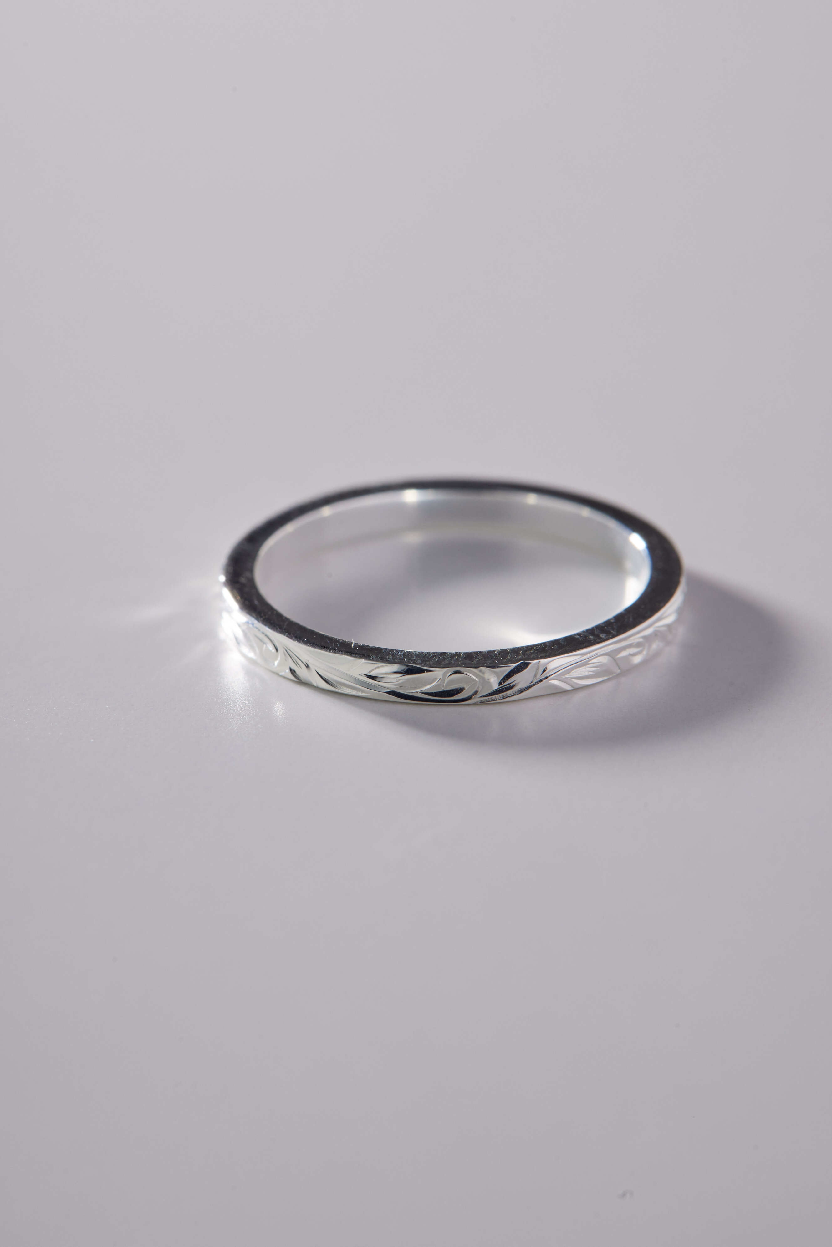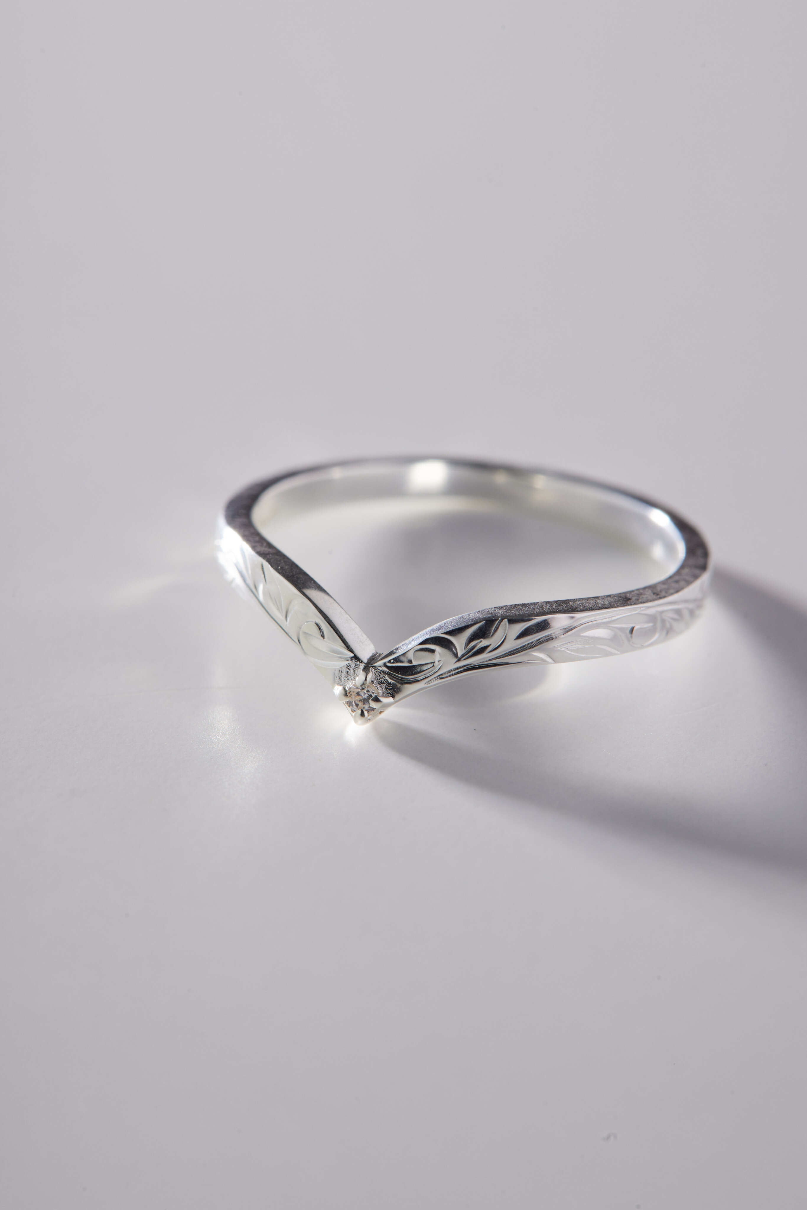 2mmの華奢なデザインに手彫りにて施したプリンセスの柄と、リングの半分に石が敷き詰められたハーフエタニティリング。“永遠の愛”と“希望”の意味が込められています。シルバー925にジルコニアのものの他に、18金にダイアモンドをあしらったスペシャルバージョンもご用意。