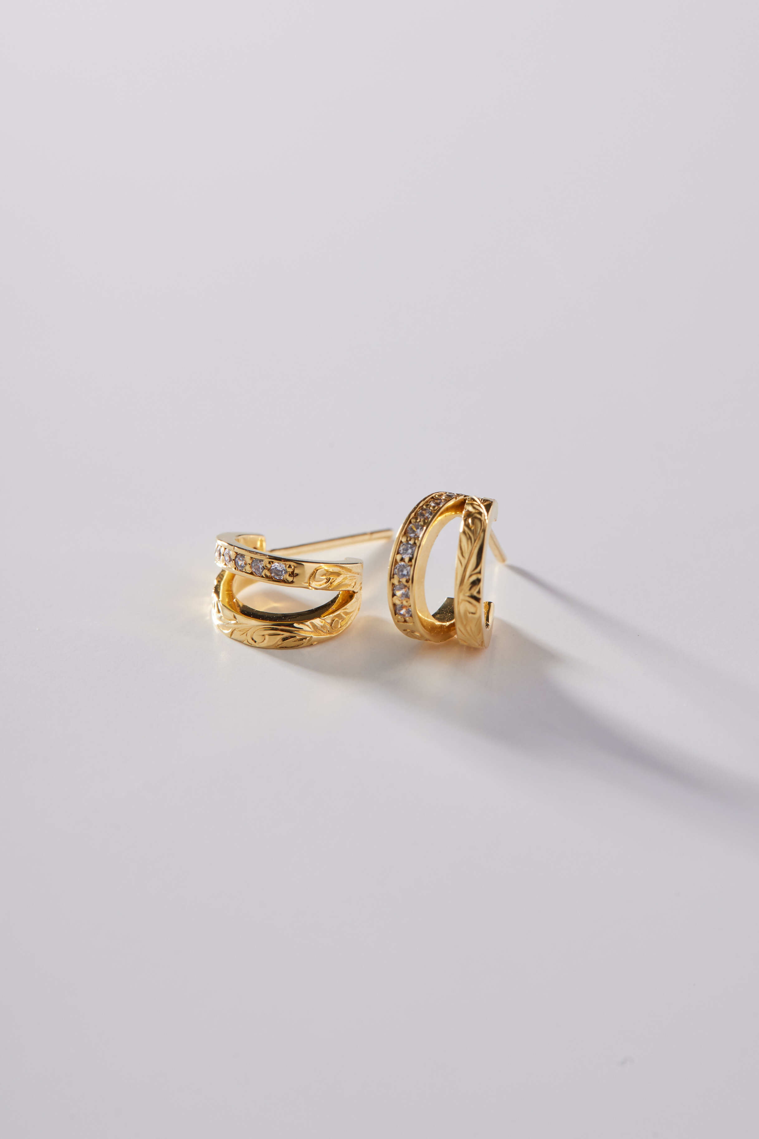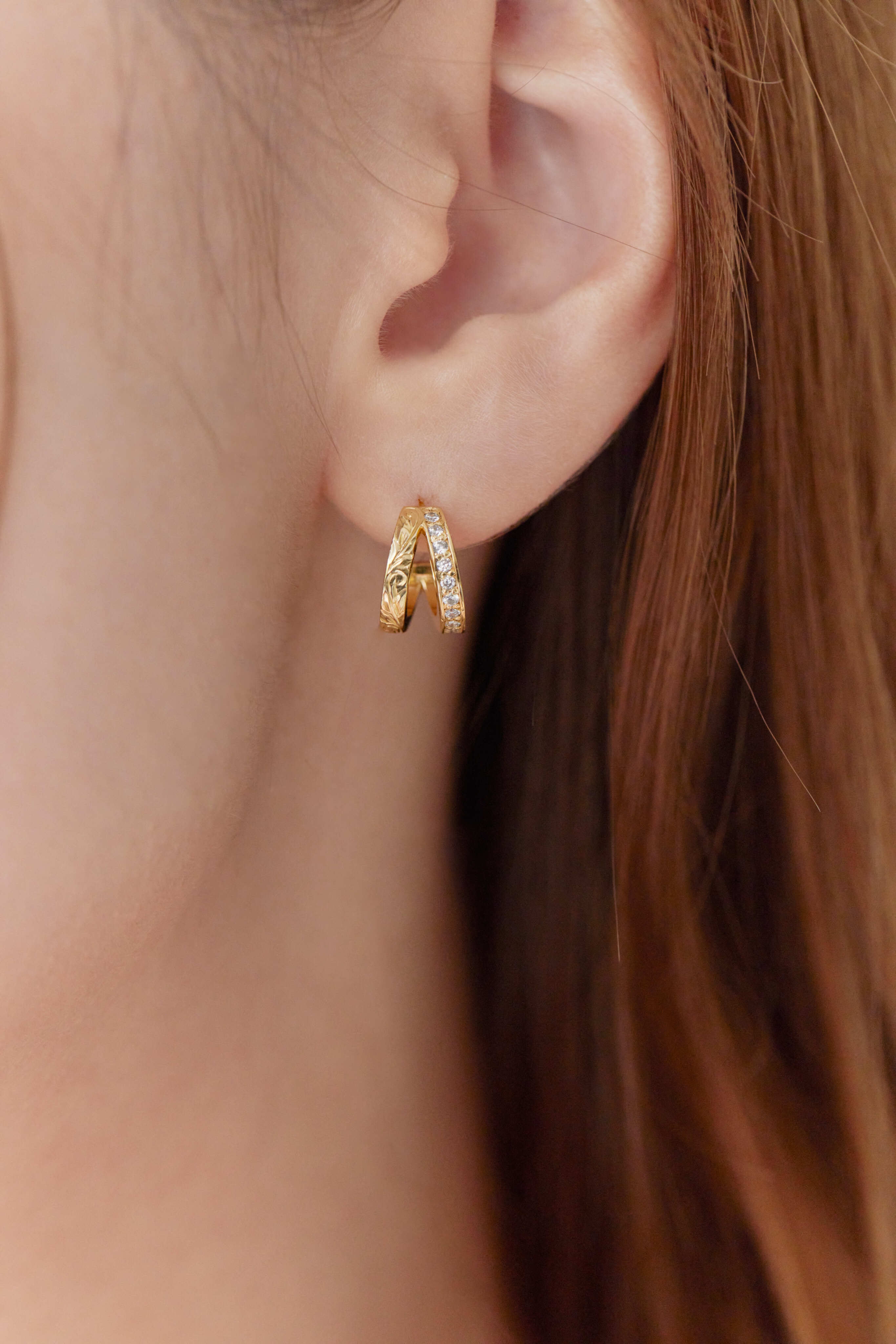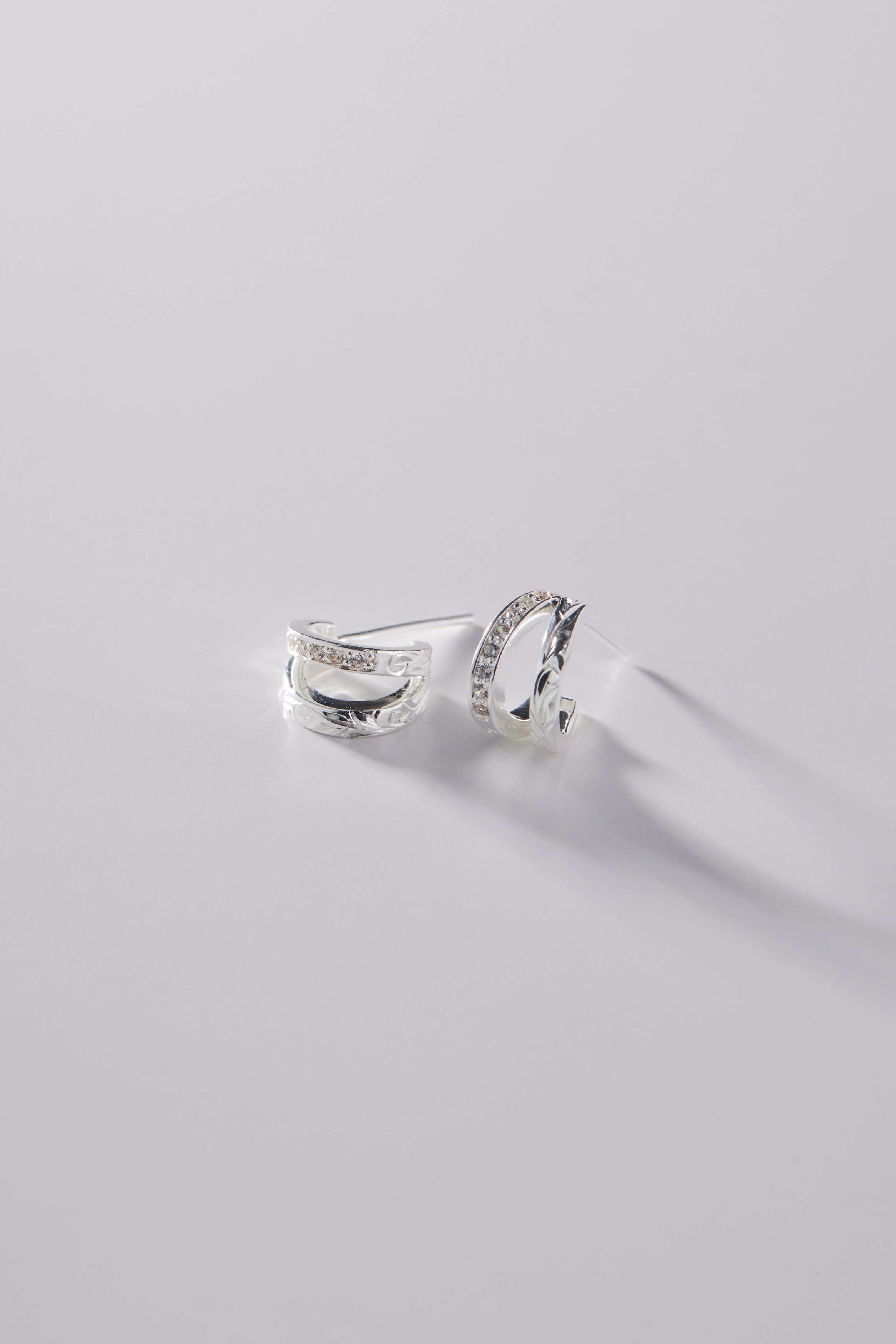 手彫りにて施したプリンセスの柄と、半分に石が敷き詰められたピアス。プリンセスの柄には、“ハワイの希望の星”と謳われ、愛と希望を与え続けたプリンセス カイウラニをイメージしています。