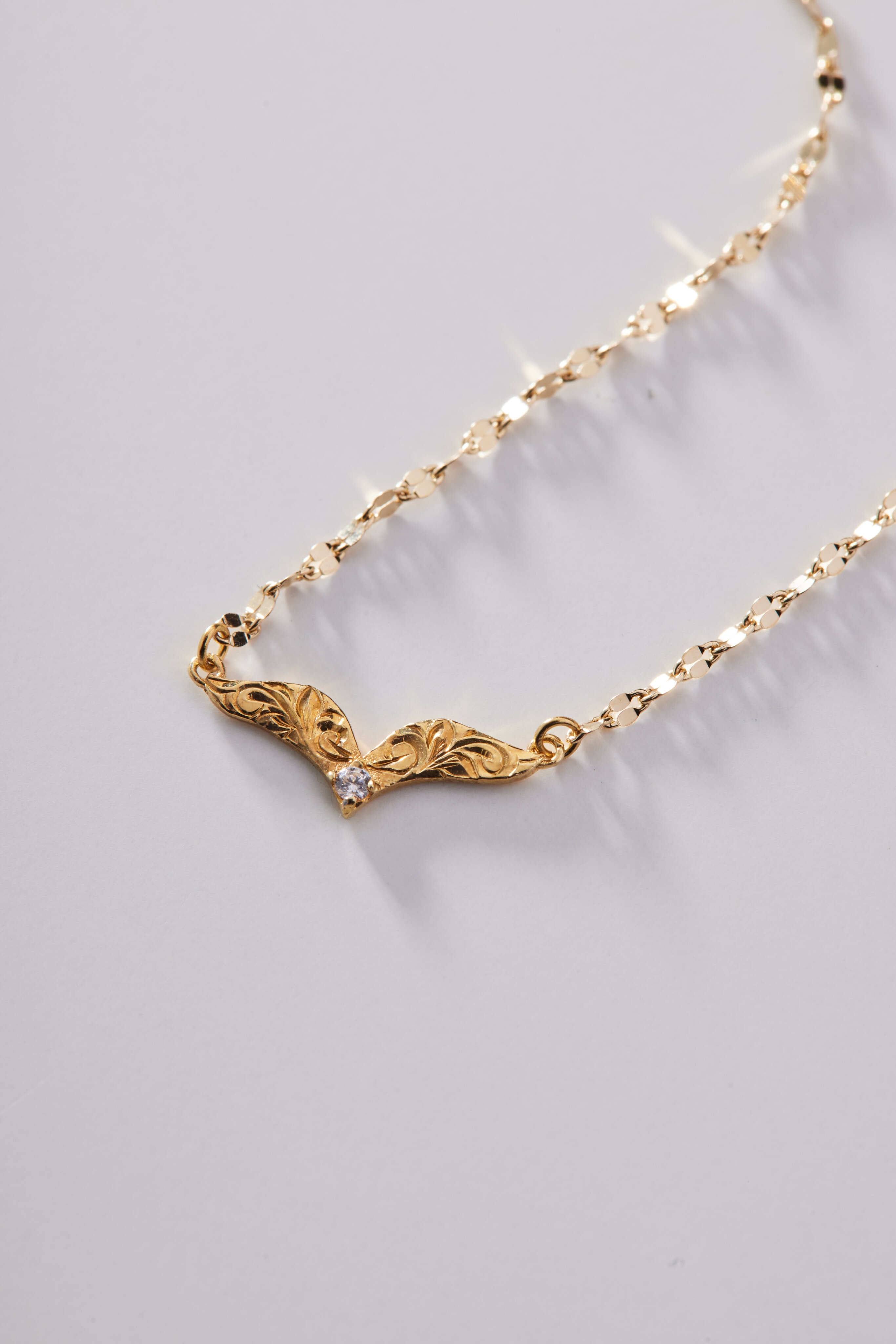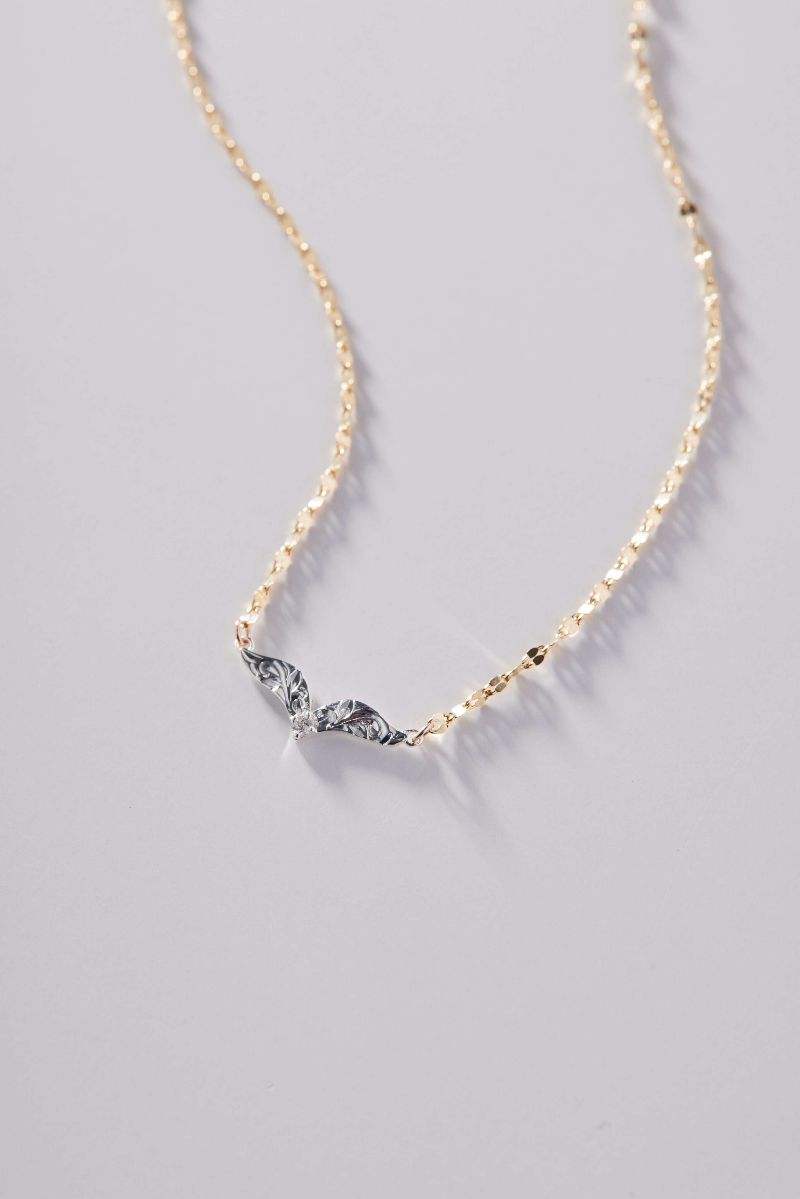 ホエールテールのネックレス。クジラが潜っていく瞬間はハワイでもなかなか見ることができない珍しい光景です。見ることができた人には幸運が訪れるといわれています。そんなホエールテールとサンセットが重なったさらに奇跡的な瞬間をイメージして中心にストーン1石と、キラキラしたデザインチェーンを使用しています。silver925にジルコニアのものの他に、10金にダイアモンドをあしらったスペシャルバージョンもご用意。