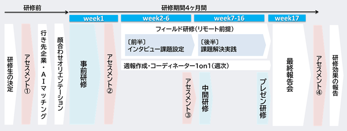 地域越境ビジネス実践プログラムは4ヶ月間の研修プログラムとなります。受講生は10時間程度の座学(実践型スキル習得研修)を受講後、リモート環境下でダブルワーク型フィールド研修(月間30時間×4か月)を通じて、企業課題や地域課題の解決に取り組みます。その際に、次世代リーダーに必須のスキルである生成AIなどのデジタルスキルを駆使して、地域企業におけるビジネスへ実装を行います。