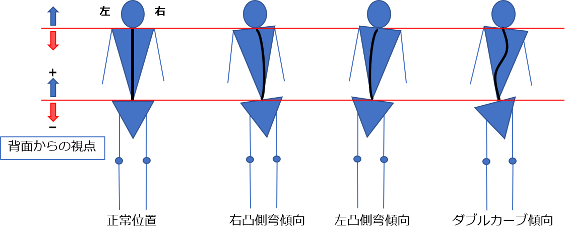 介入群22名のうち、(1)右凸側弯傾向:15名 (2)左凸側弯傾向:2名 (3)ダブルカーブ傾向:1名で、側弯傾向の事例が見られた。