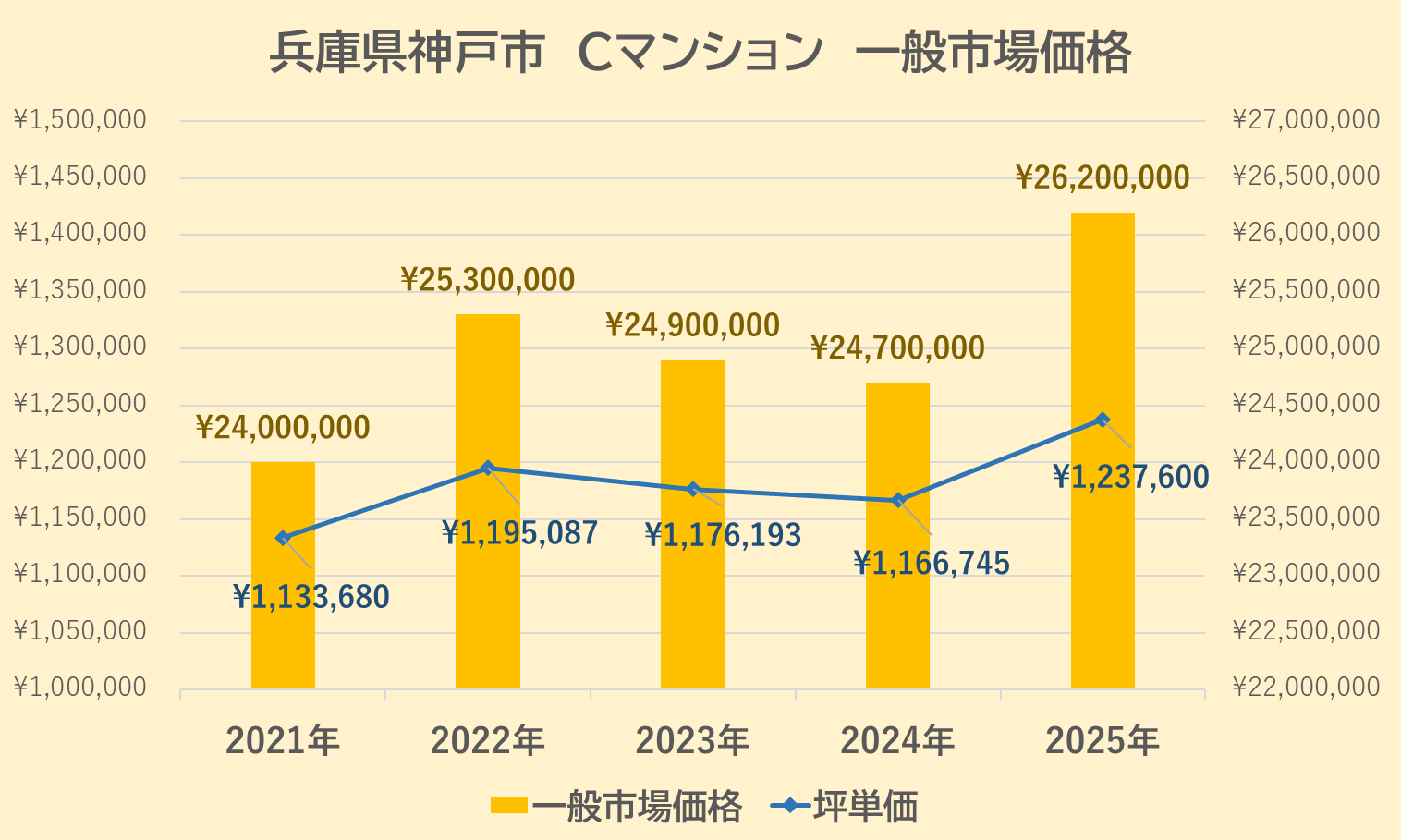 2021年は2,400万円(@113万円)でしたが、翌2022年は2,530万円(@119万円)と上昇、2023年は2,490万円(@117万円)、2024年は2,470万円(@116万円)と続けて下降し、2025年は2,620万円(@123万円)と大きく上昇をしていることがわかります。