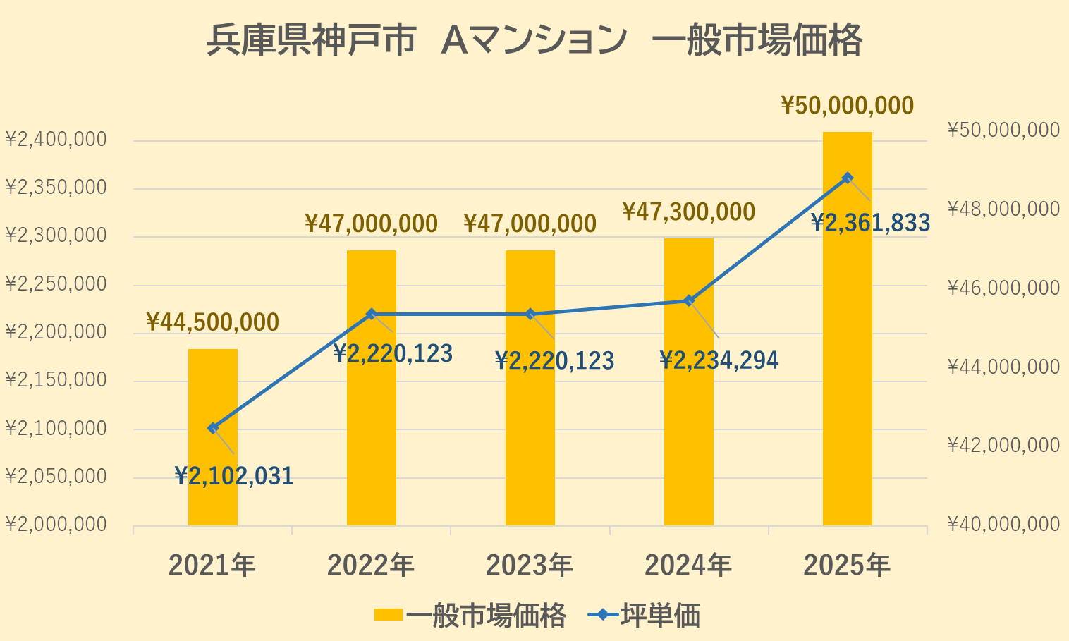 2021年は4,450 万円(坪単価:約210万円 (以下 @210万円) )でしたが、翌2022年は4,700万円(@222万円)と上昇、2023年は4,700万円(@222万円)と横ばい、2024年4,730万円(@223万円)には微増し、2025年は5,000万円(@236万円)と大きく上昇したことがわかります。