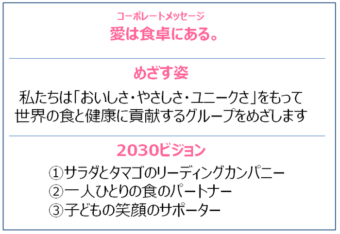 キユーピーグループはコーポレートメッセージ「愛は食卓にある。」に込めた想いのもと、サラダとタマゴを中心に、「おいしさ・やさしさ・ユニークさ」をもって世界の食と健康に貢献することをめざしています。この「めざす姿」を実現するため、2030年に“どうありたいか”を表した「キユーピーグループ2030ビジョン」では、①サラダとタマゴのリーディングカンパニー、②一人ひとりの食のパートナー、③子どもの笑顔のサポーター、の3つの視点を掲げています。