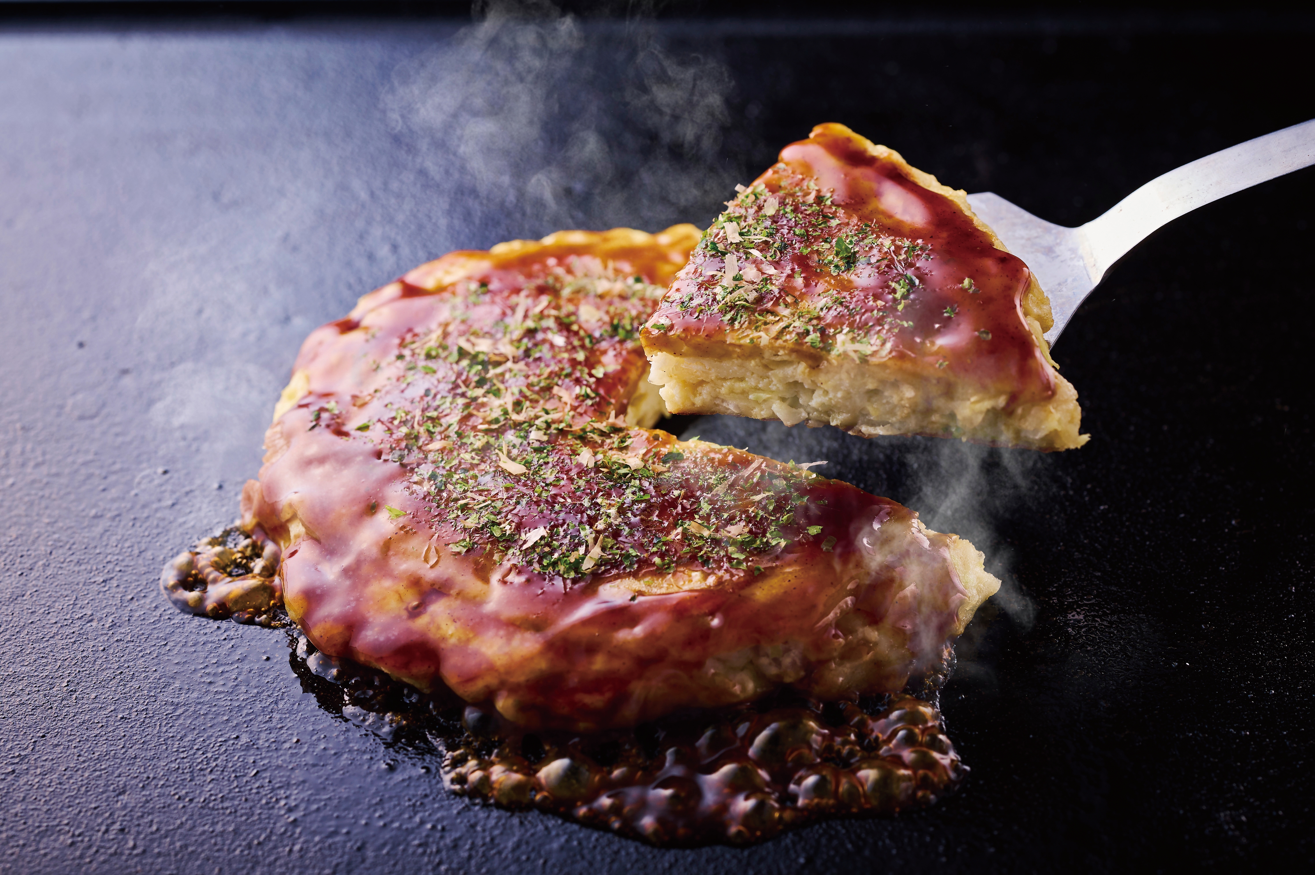 お好み焼きには欠かせないキャベツ・卵・豚肉・小麦粉はすべて国産を使用。コテを返さない製法で生地に空気を含ませ、ふんわり食感に仕上げました。特製のソースは、スーパーフードとも呼ばれるドライフルーツ「デーツ」と、オイスターエキスを使用し、甘味と旨味のバランスにこだわっています。