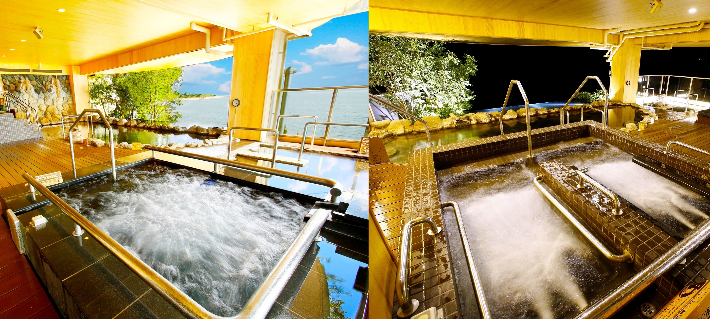 ・開放的な大浴場の大きな窓ガラスからは大海原を望め、昼も夜もお楽しみいただけます。