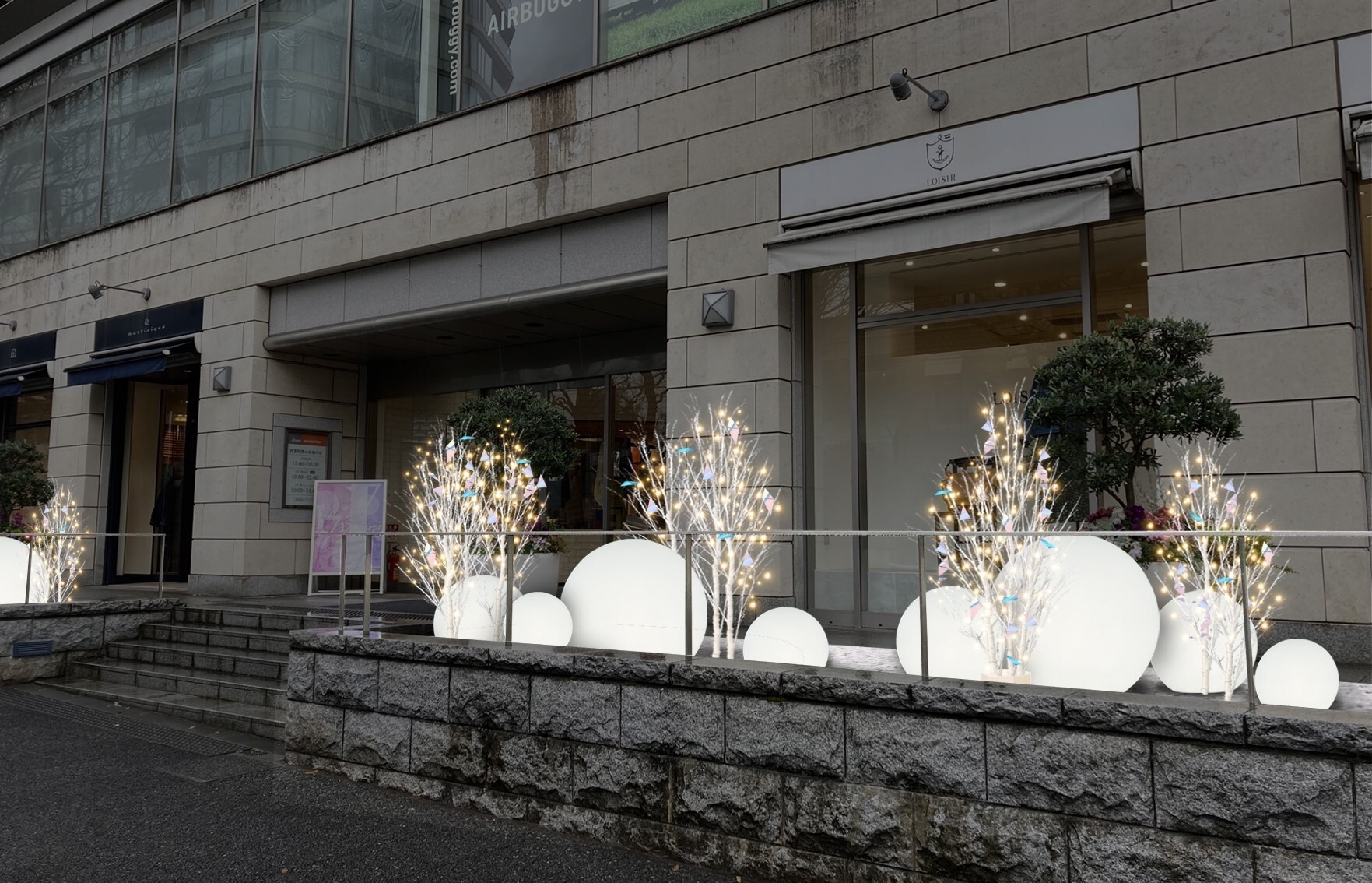 柔らかい光を放つ、大小さまざまな20台のボール型ライトと白枝ツリーによって、雪が積もった自然の風景を表現。いつもと違う華やかなエントランスがお客様をお出迎えいたします。