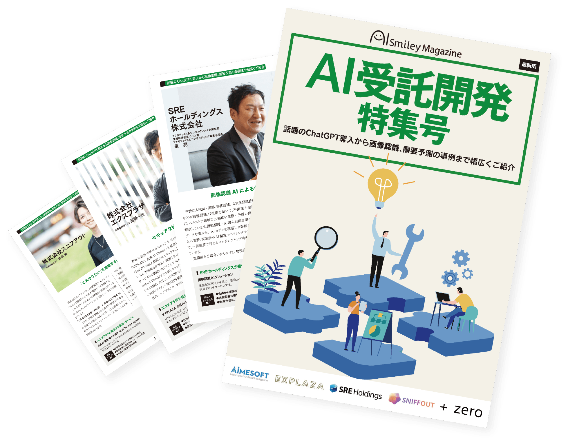 お問い合わせ完了後にご登録されたEメールにAIsmileyの担当から「AI受託開発特集号」(PDF)をメールにて送付させていただきます。