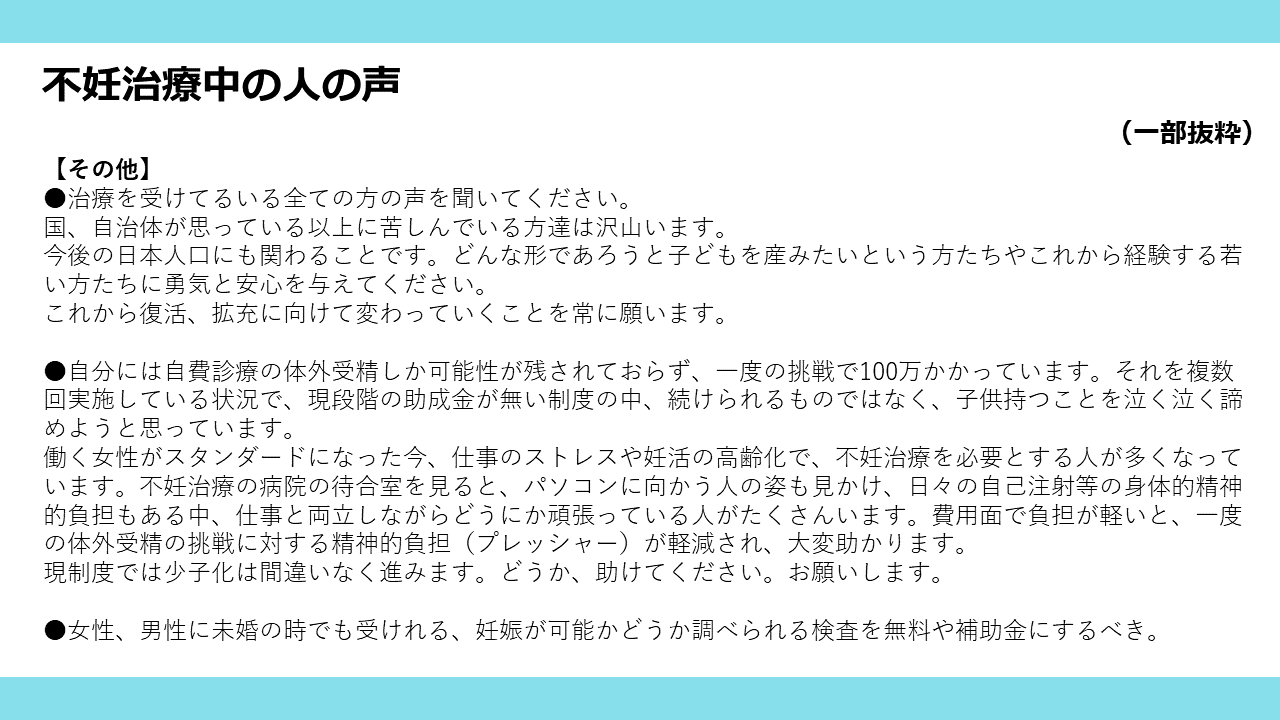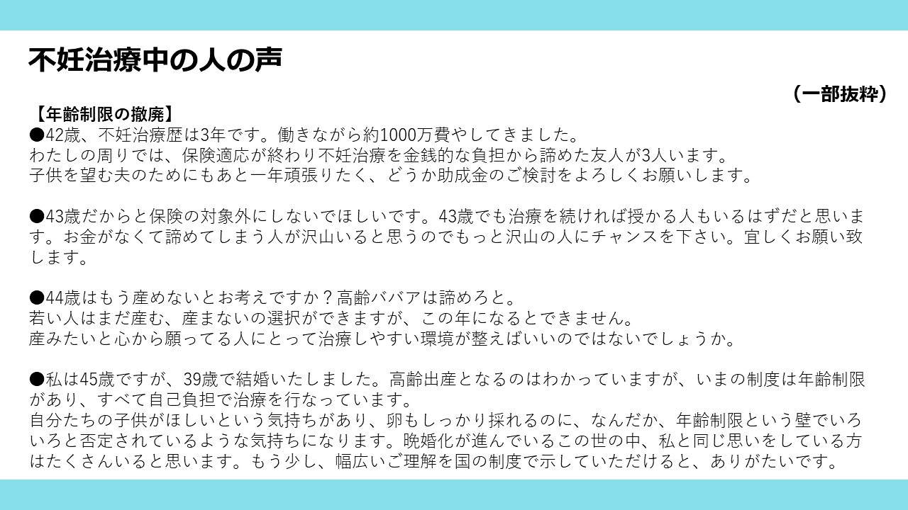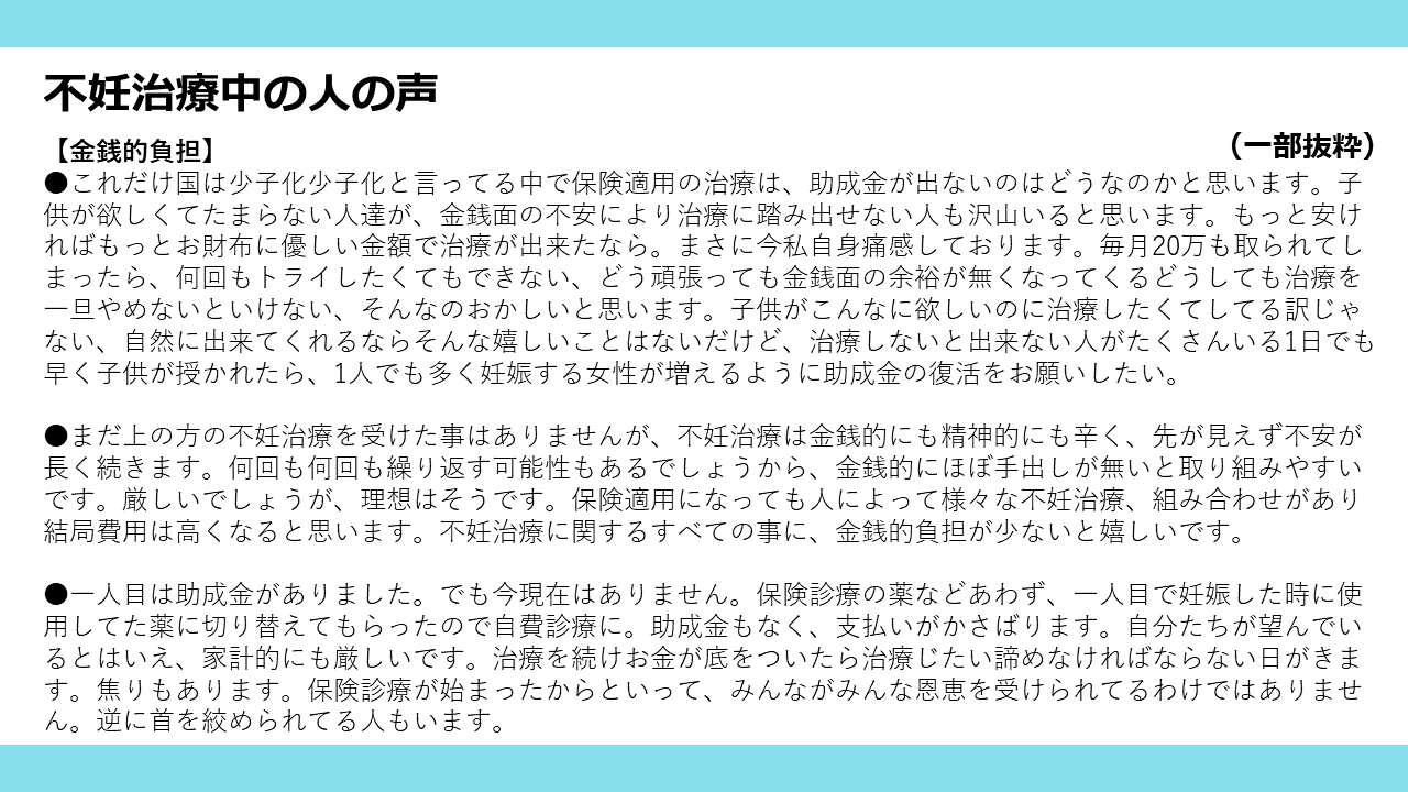 一般不妊治療の不妊検査や高度生殖医療の負担額を減らすための助成金を求める声が多く上がっています。