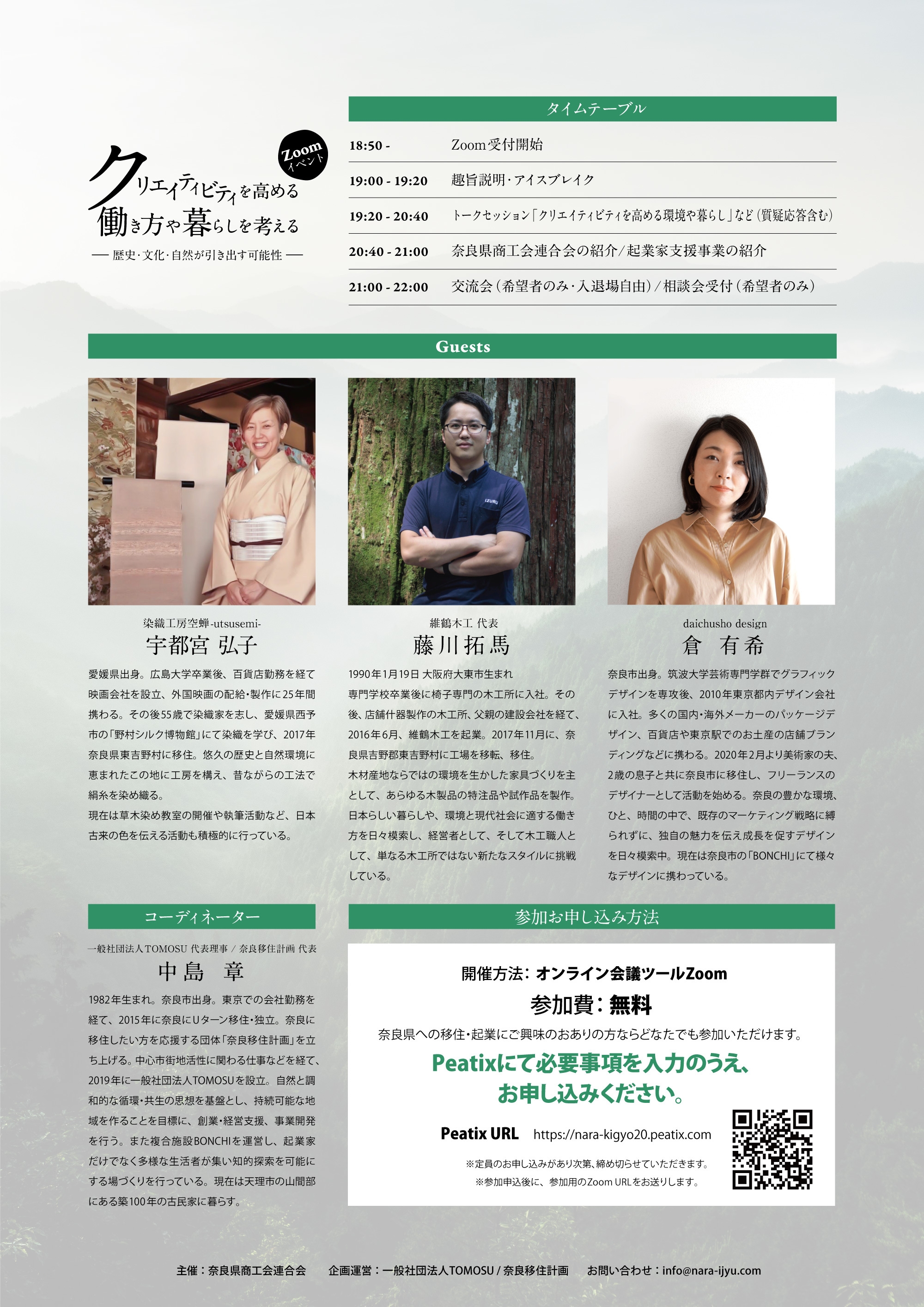 奈良県商工会連合会は、「奈良県起業家支援事業」の一環として、3名のクリエイターから奈良移住についての本音が聞けるイベント「クリエイティビティを高める働き方や暮らしを考える~歴史・文化・自然が引き出す可能性~」をオンライン会議ツールZoomにて2020年8月29日(土)に開催いたします。