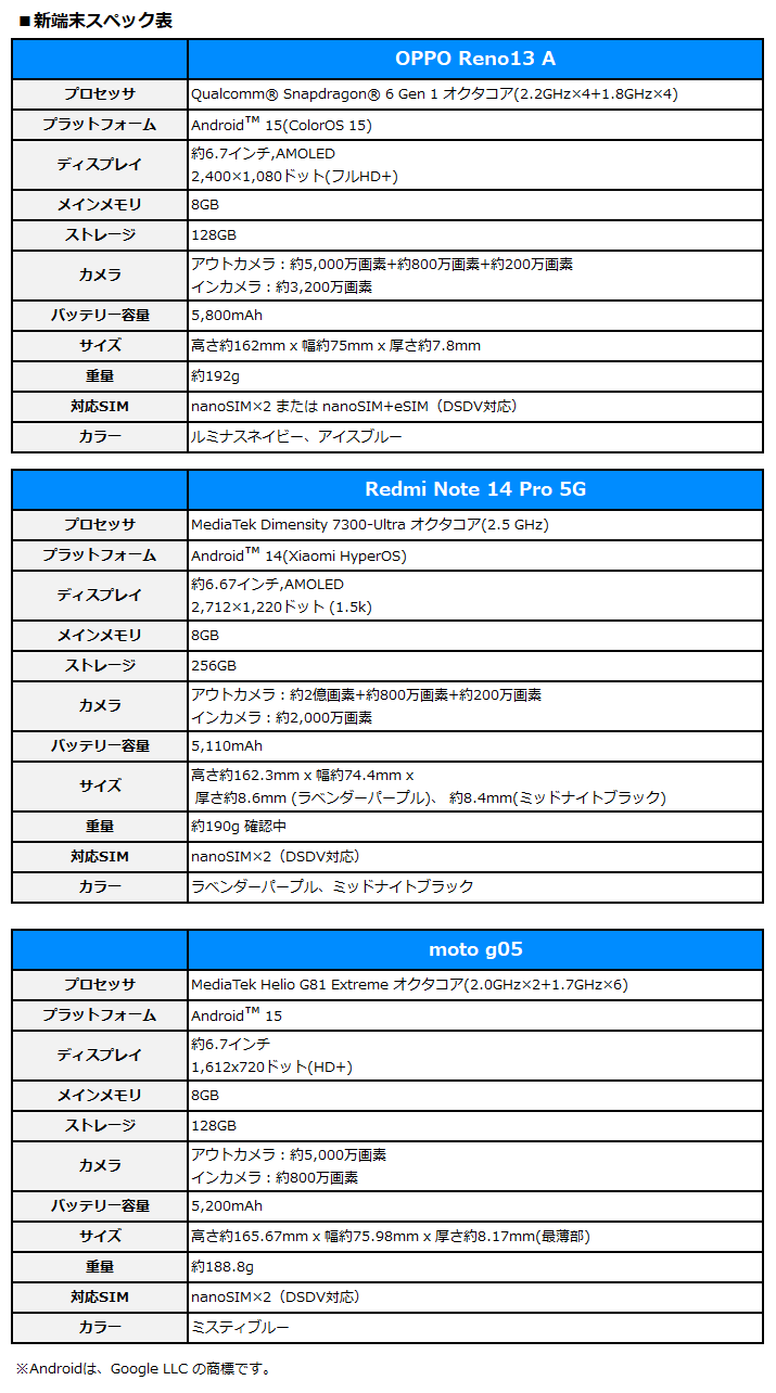 ビッグローブ株式会社(本社:東京都品川区、代表取締役社長:山田 靖久、以下 BIGLOBE)は、モバイルサービス「BIGLOBEモバイル」において、OPPO製スマートフォン「OPPO Reno13 A」、Xiaomi製スマートフォン「Redmi Note 14 Pro 5G」、モトローラ製スマートフォン「moto g05」の提供を2025年7月22日より開始いたします(注1)。