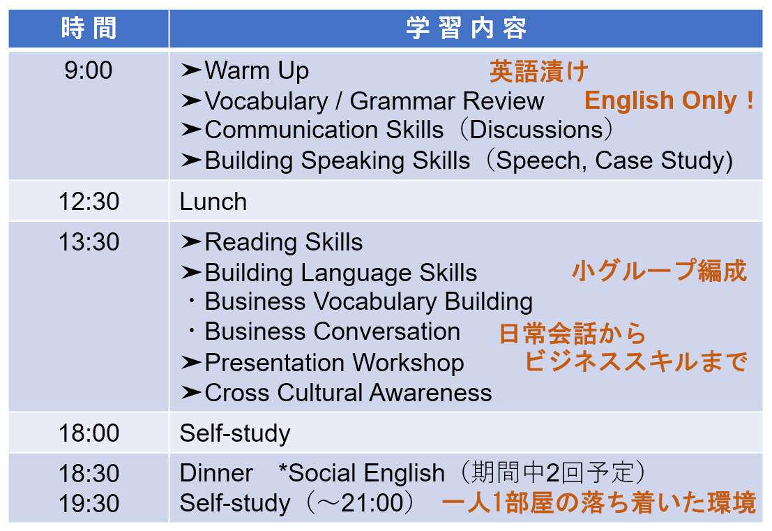 2週間で、ビジネスを成功させる強力なツールを提供する研修として、海外出張や赴任予定の方、また日常業務で英語を必要としている方はもちろん、英語を仕事に生かしたい方にもお勧めのコースです。